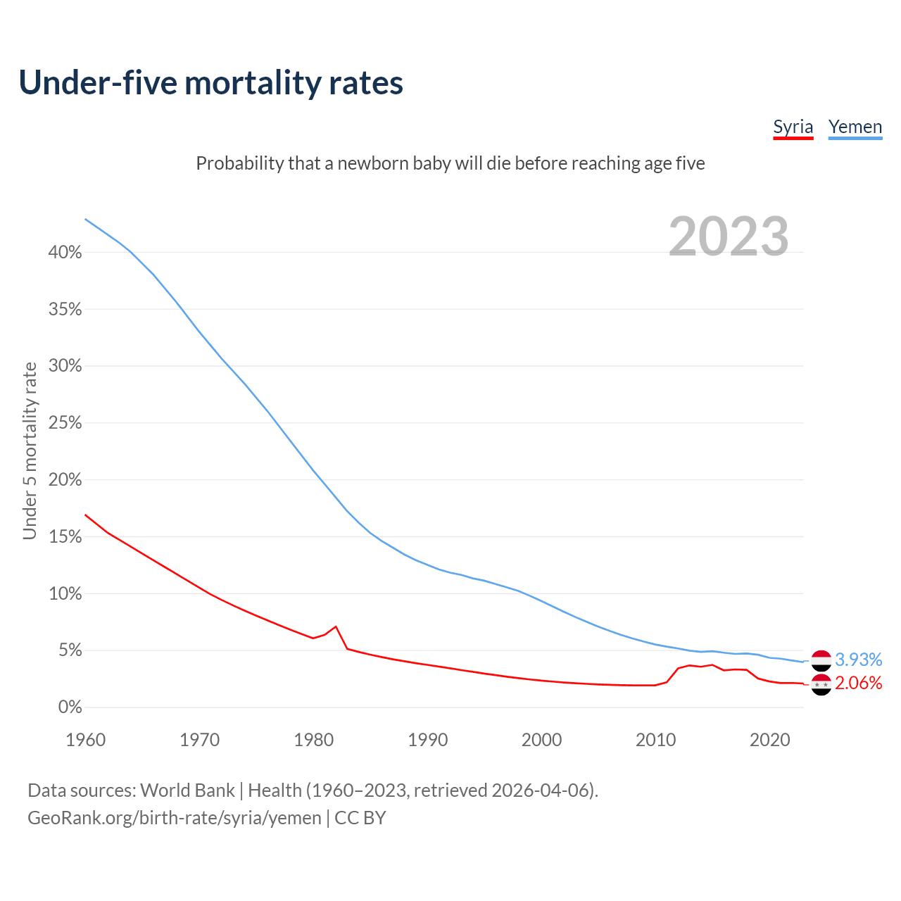 The chance that a newborn baby will die before reaching age five is 2.06% in Syria and 3.93% in Yemen. Above is a chart with historical data on under-five mortality rates.