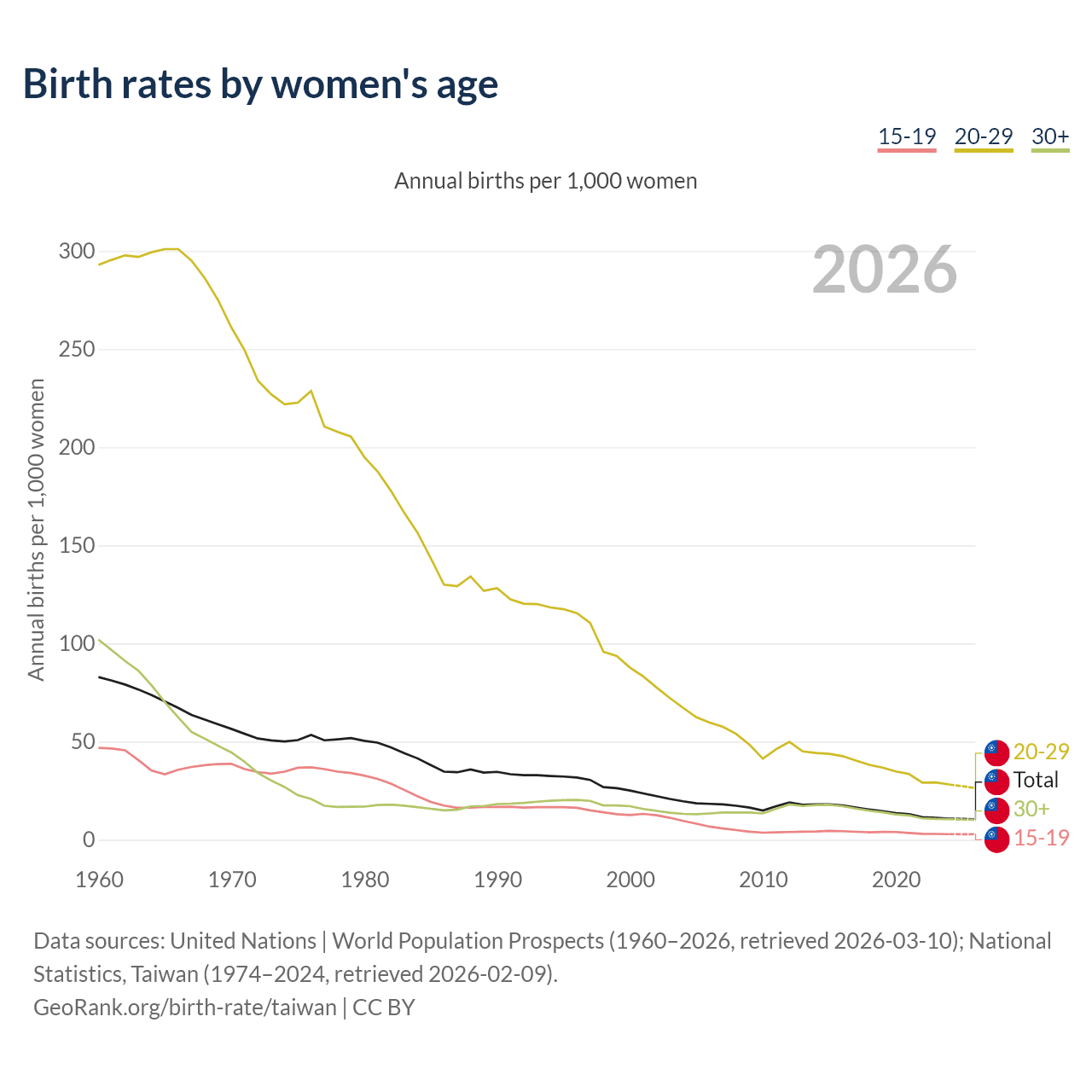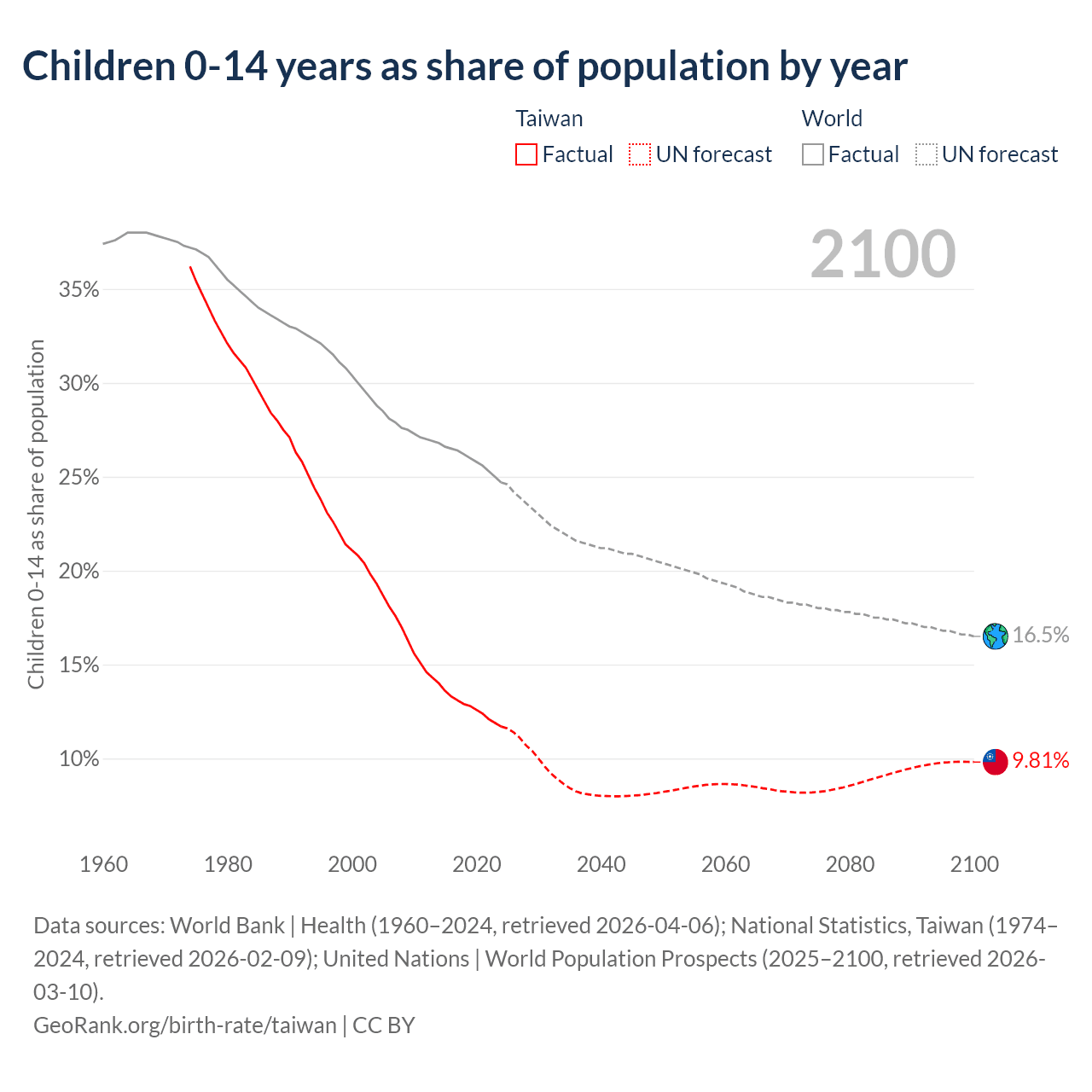Data sources: World Bank | Health (1960–2024, retrieved 2026-04-06); National Statistics, Taiwan (1974–2024, retrieved 2026-02-09); United Nations | World Population Prospects (2025–2100, retrieved 2026-03-10).