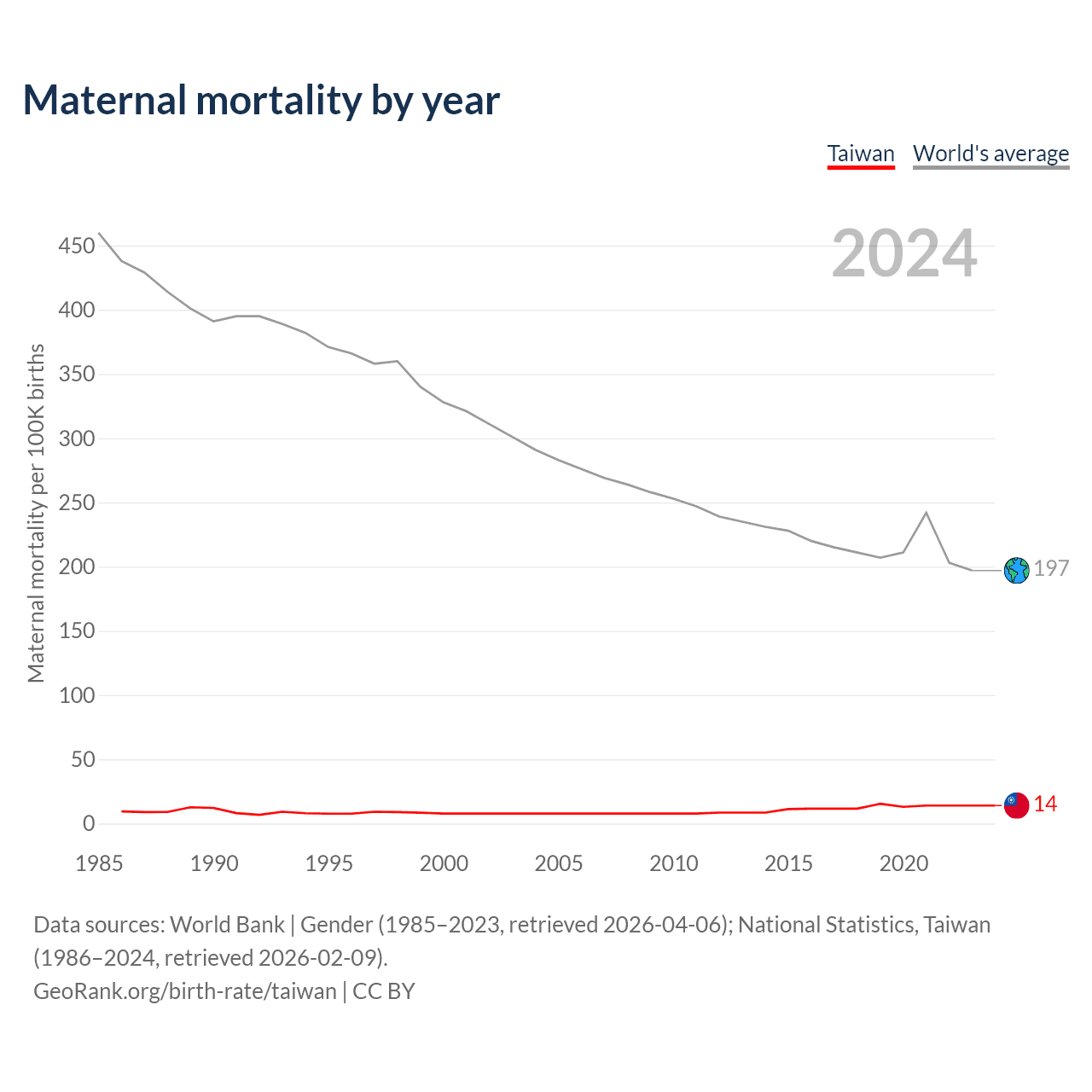 The maternal mortality rate in Taiwan was 14 deaths per 100,000 live births in 2024 — a 0.01% chance of dying during childbirth or within 42 days of pregnancy termination. This is a 79.5% increase compared to the year 2000.