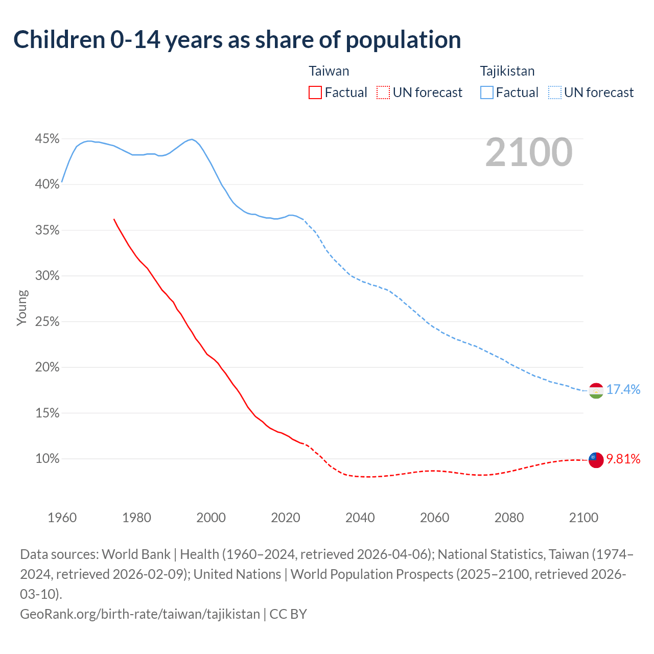 Data sources: World Bank | Health (1960–2024, retrieved 2026-04-06); National Statistics, Taiwan (1974–2024, retrieved 2026-02-09); United Nations | World Population Prospects (2025–2100, retrieved 2026-03-10).