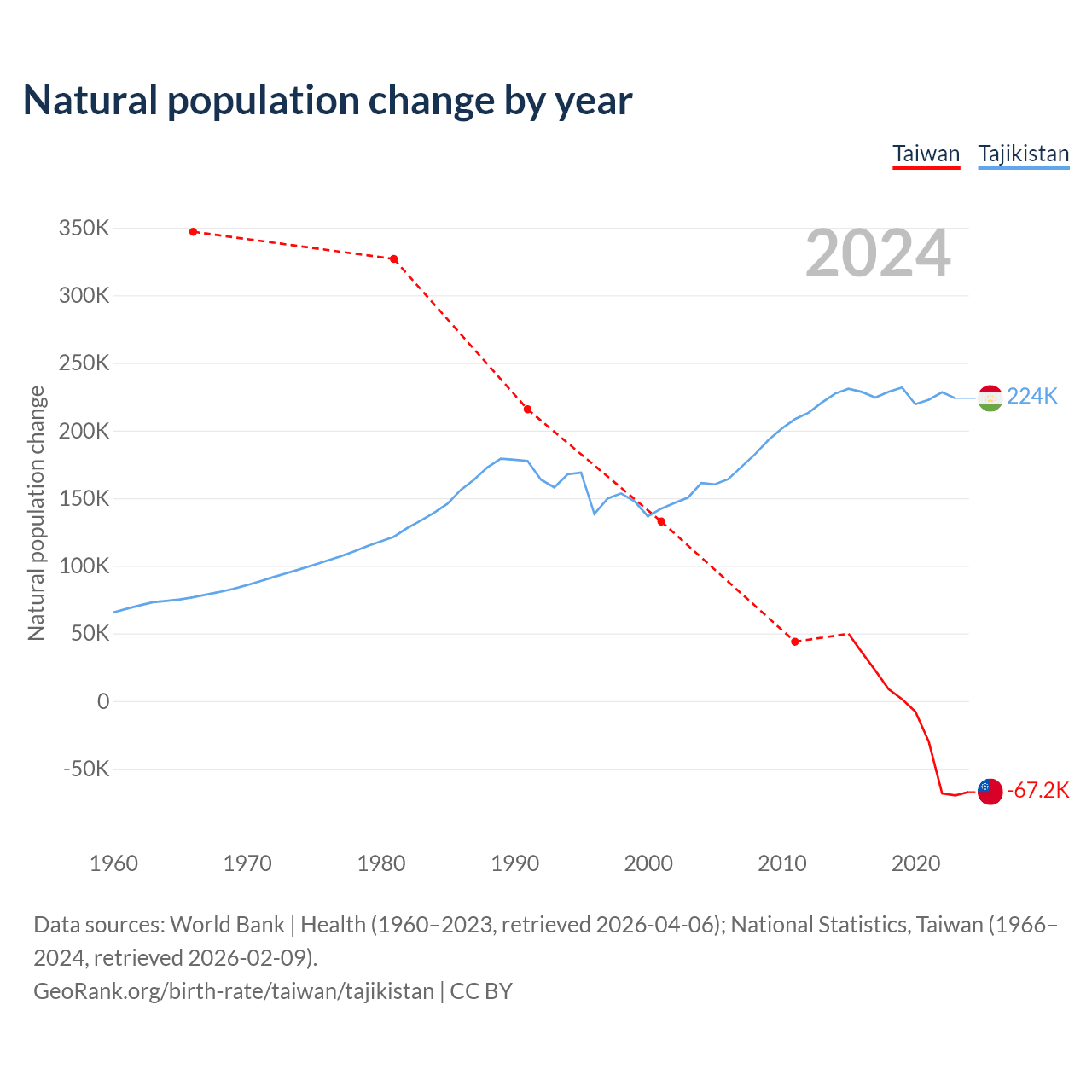 Data sources: World Bank | Health (1960–2023, retrieved 2026-04-06); National Statistics, Taiwan (1951–2024, retrieved 2026-02-09).