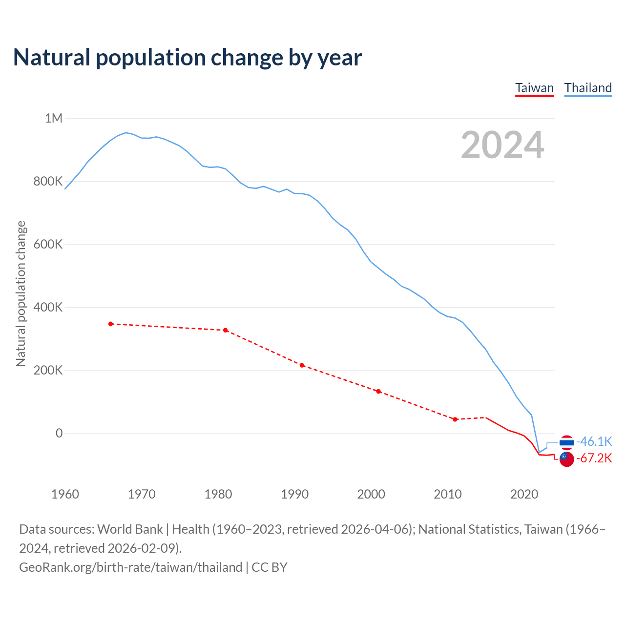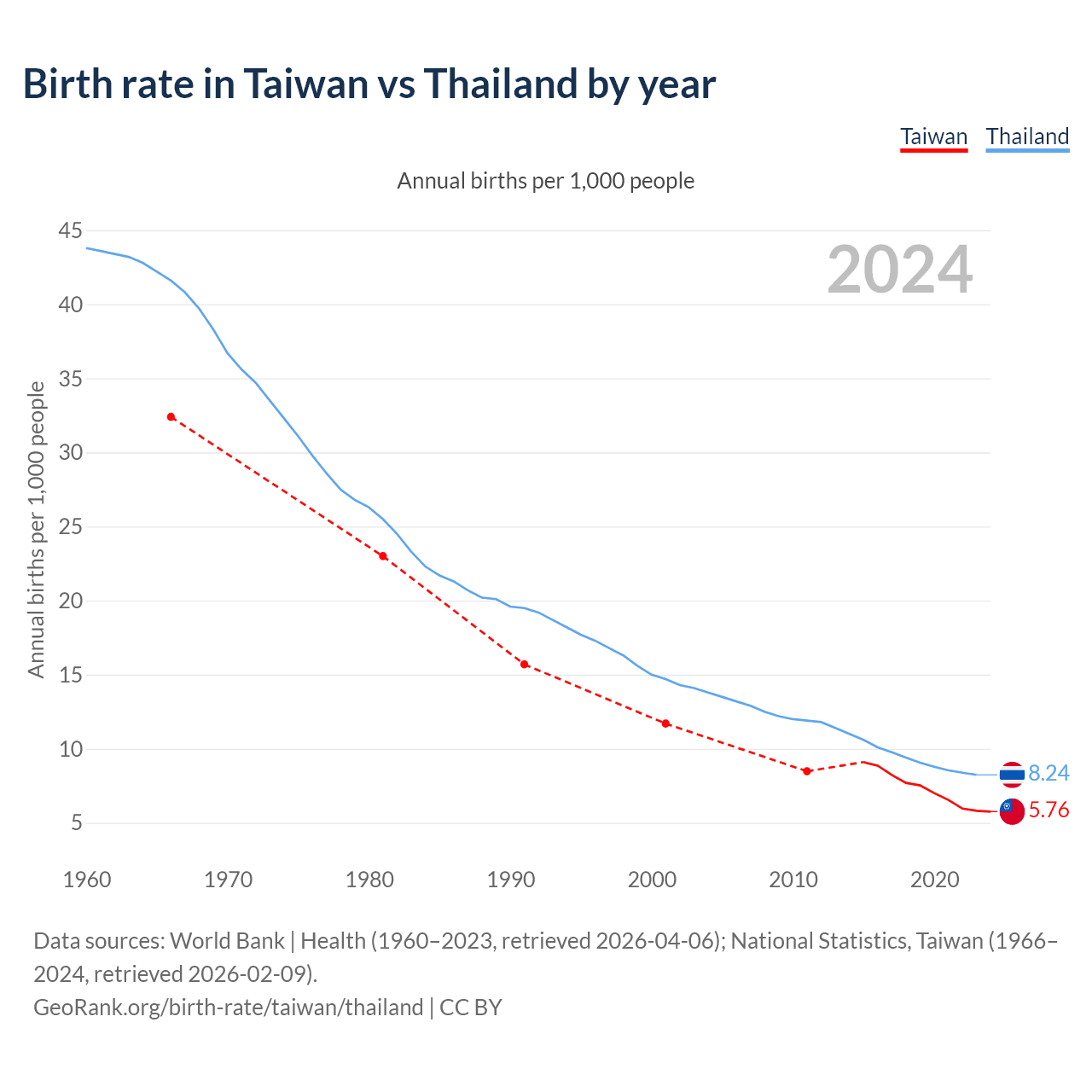 Data sources: World Bank | Health (1960–2023, retrieved 2026-04-06); National Statistics, Taiwan (1951–2024, retrieved 2026-02-09).