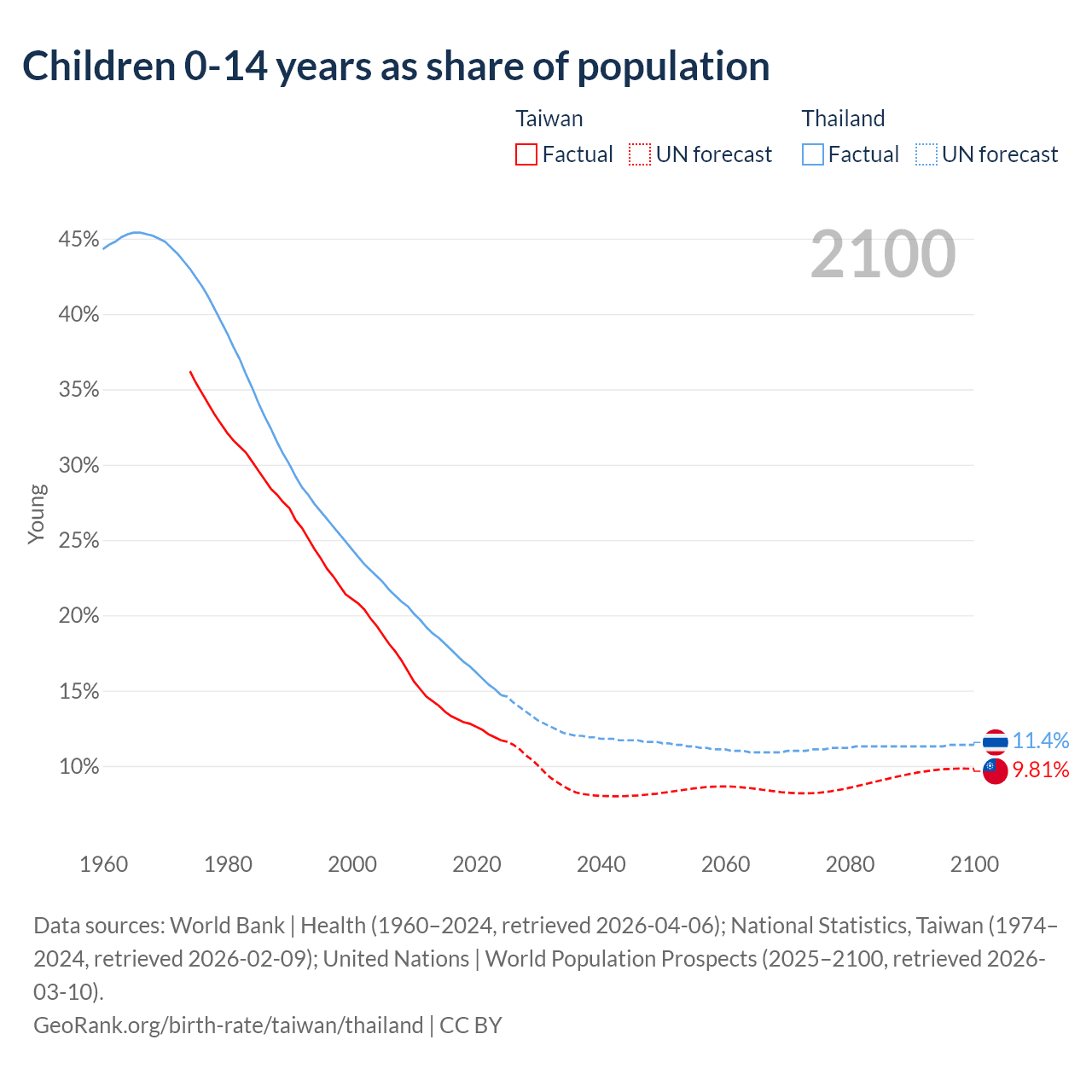 Data sources: World Bank | Health (1960–2024, retrieved 2026-04-06); National Statistics, Taiwan (1974–2024, retrieved 2026-02-09); United Nations | World Population Prospects (2025–2100, retrieved 2026-03-10).