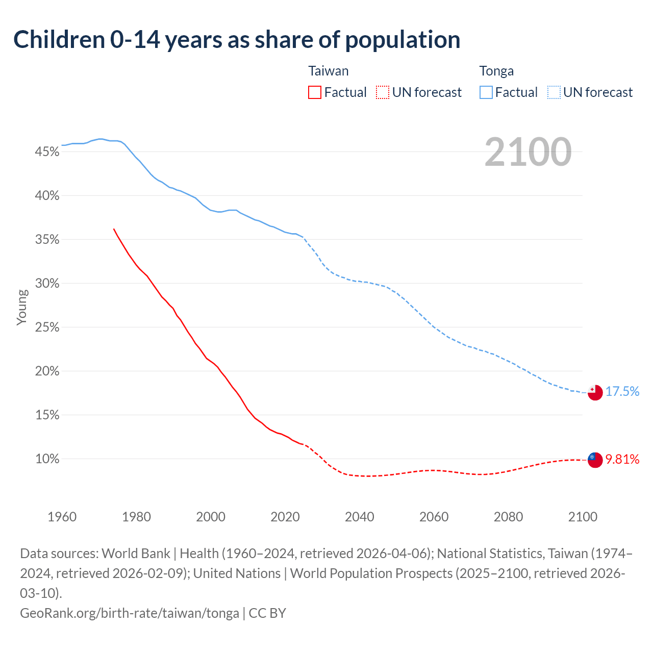 Children aged 0-14 make up 11.7% of the population in Taiwan and 35.4% in Tonga in 2024, compared to 27.1% and 40.8% respectively in 1990.