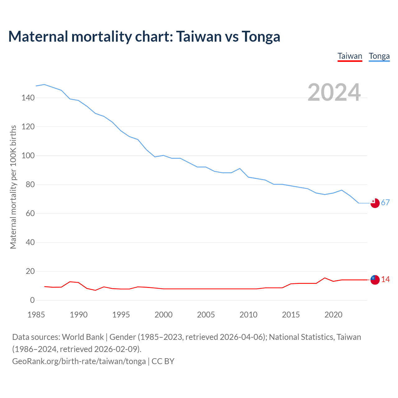 The maternal mortality rate, which is the probability of dying during childbirth or within 42 days of pregnancy termination, is 14 deaths per 100,000 live births in Taiwan, compared to 67 deaths in Tonga.