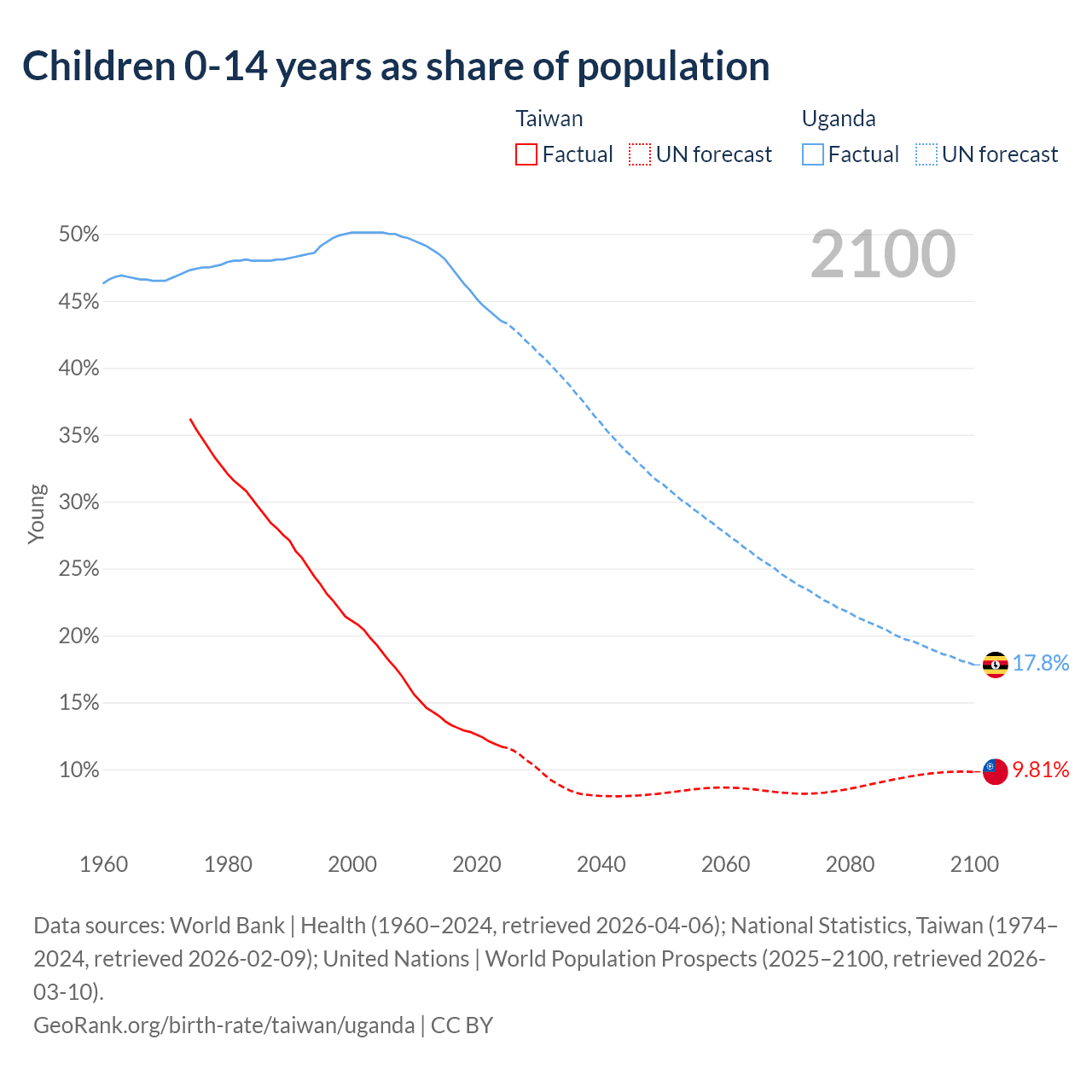 Children aged 0-14 make up 11.7% of the population in Taiwan and 43.5% in Uganda in 2024, compared to 27.1% and 48.2% respectively in 1990.