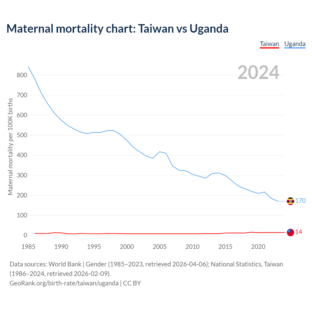The maternal mortality rate, which is the probability of dying during childbirth or within 42 days of pregnancy termination, is 14 deaths per 100,000 live births in Taiwan, compared to 170 deaths in Uganda.