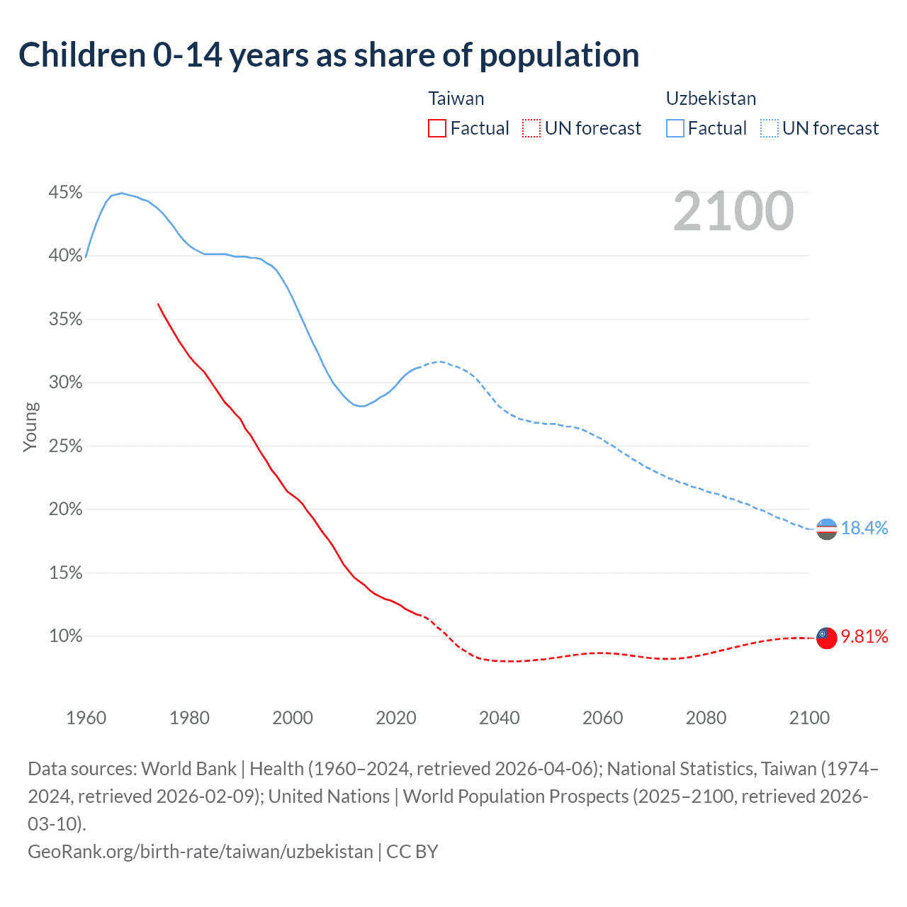 Data sources: World Bank | Health (1960–2024, retrieved 2026-04-06); National Statistics, Taiwan (1974–2024, retrieved 2026-02-09); United Nations | World Population Prospects (2025–2100, retrieved 2026-03-10).