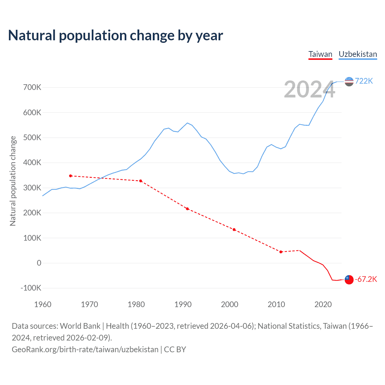 Data sources: World Bank | Health (1960–2023, retrieved 2026-04-06); National Statistics, Taiwan (1951–2024, retrieved 2026-02-09).