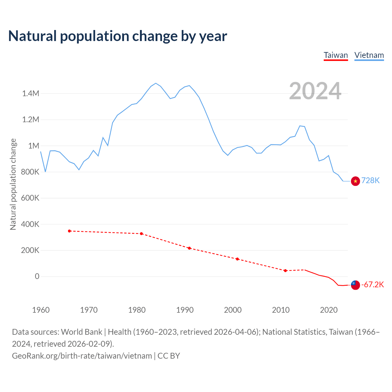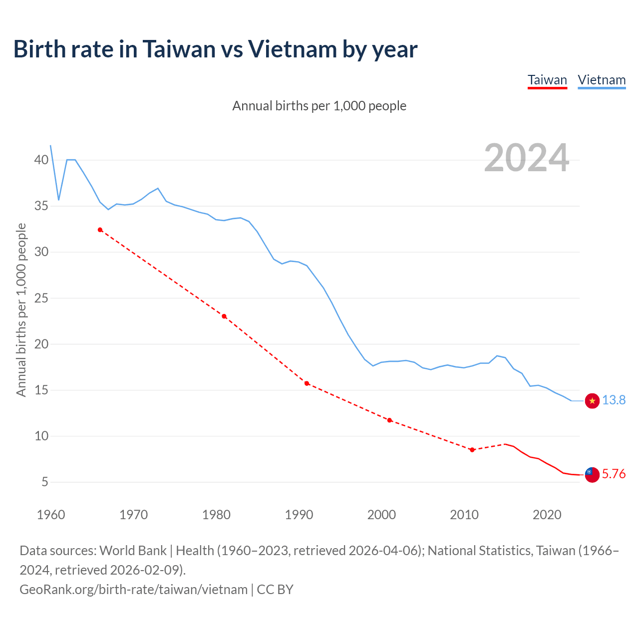 Data sources: World Bank | Health (1960–2023, retrieved 2026-04-06); National Statistics, Taiwan (1951–2024, retrieved 2026-02-09).