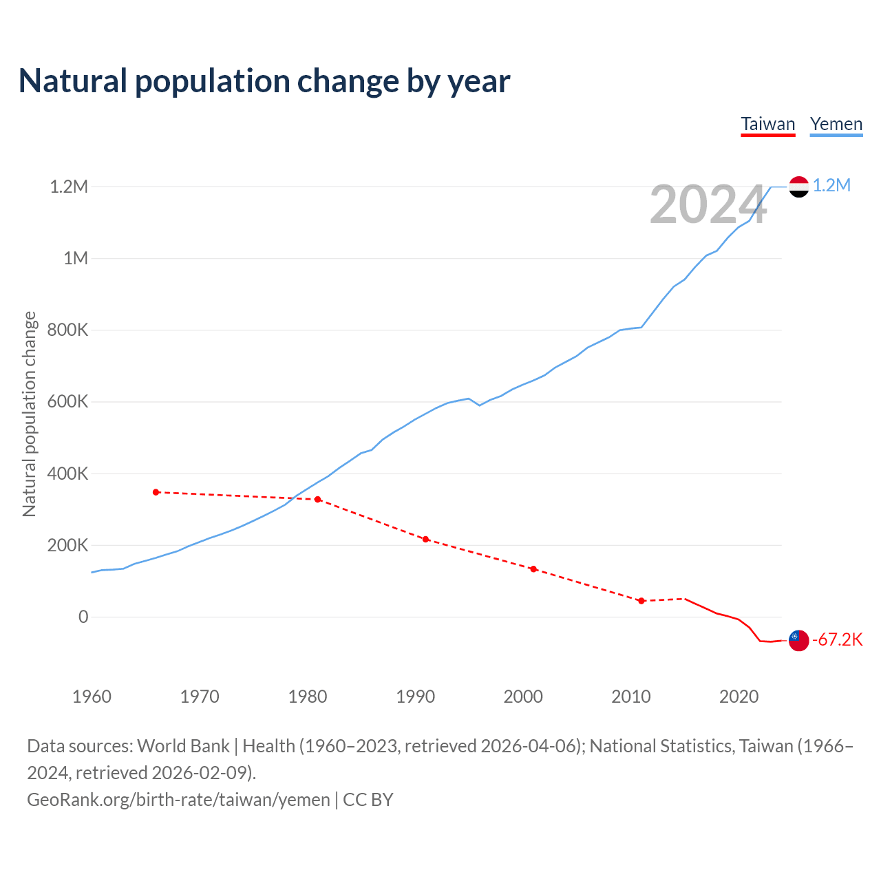 Data sources: World Bank | Health (1960–2023, retrieved 2026-04-06); National Statistics, Taiwan (1951–2024, retrieved 2026-02-09).