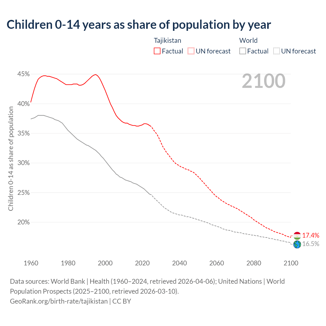 Tajikistan has a birth rate of 26.1 (annual births per 1,000 people) and a fertility rate of 3.07 (the average number of children a woman is expected to have over her lifetime based on current age-specific birth rates).