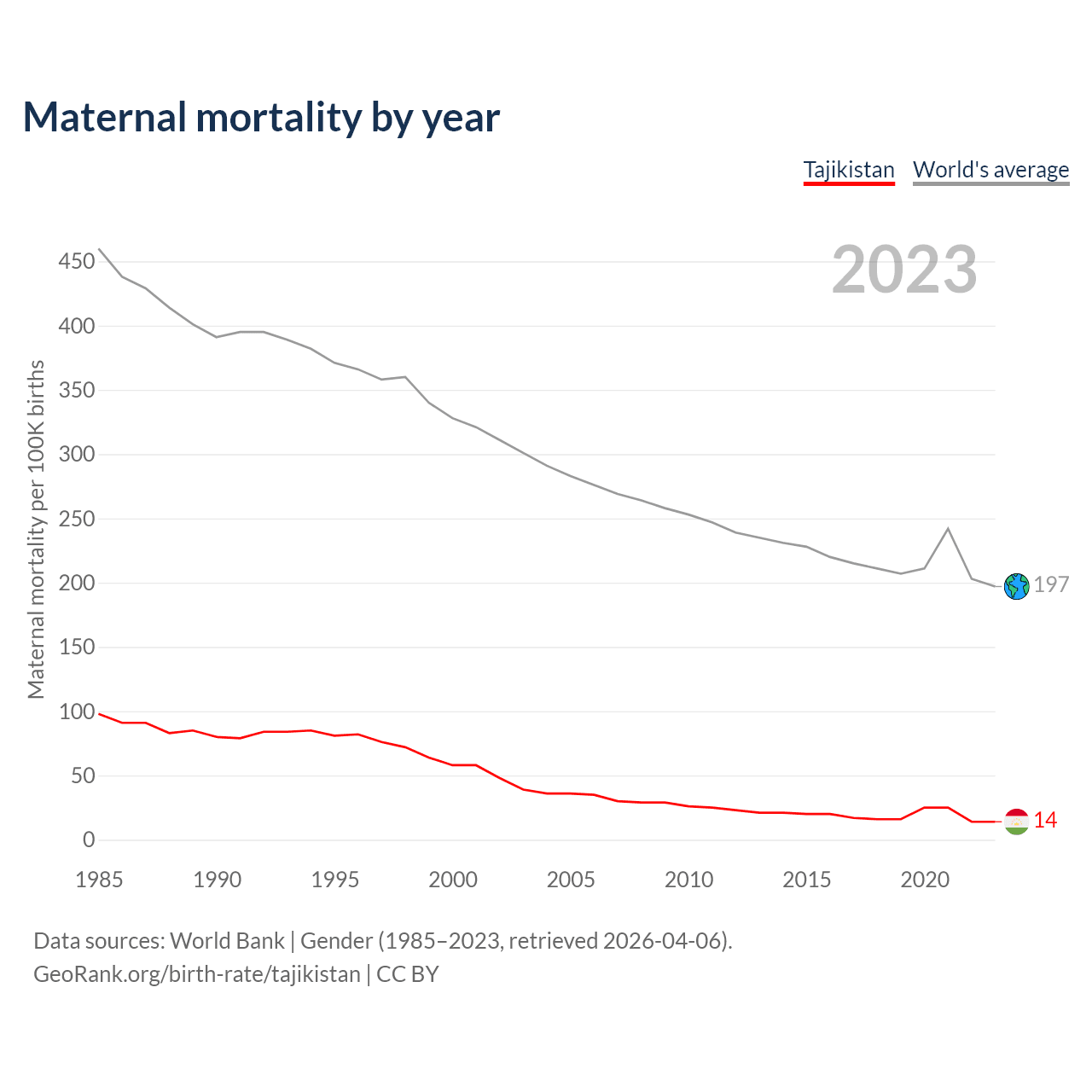 The maternal mortality rate in Tajikistan was 14 deaths per 100,000 live births in 2023 — a 0.01% chance of dying during childbirth or within 42 days of pregnancy termination. This is a 75.9% decrease compared to the year 2000.