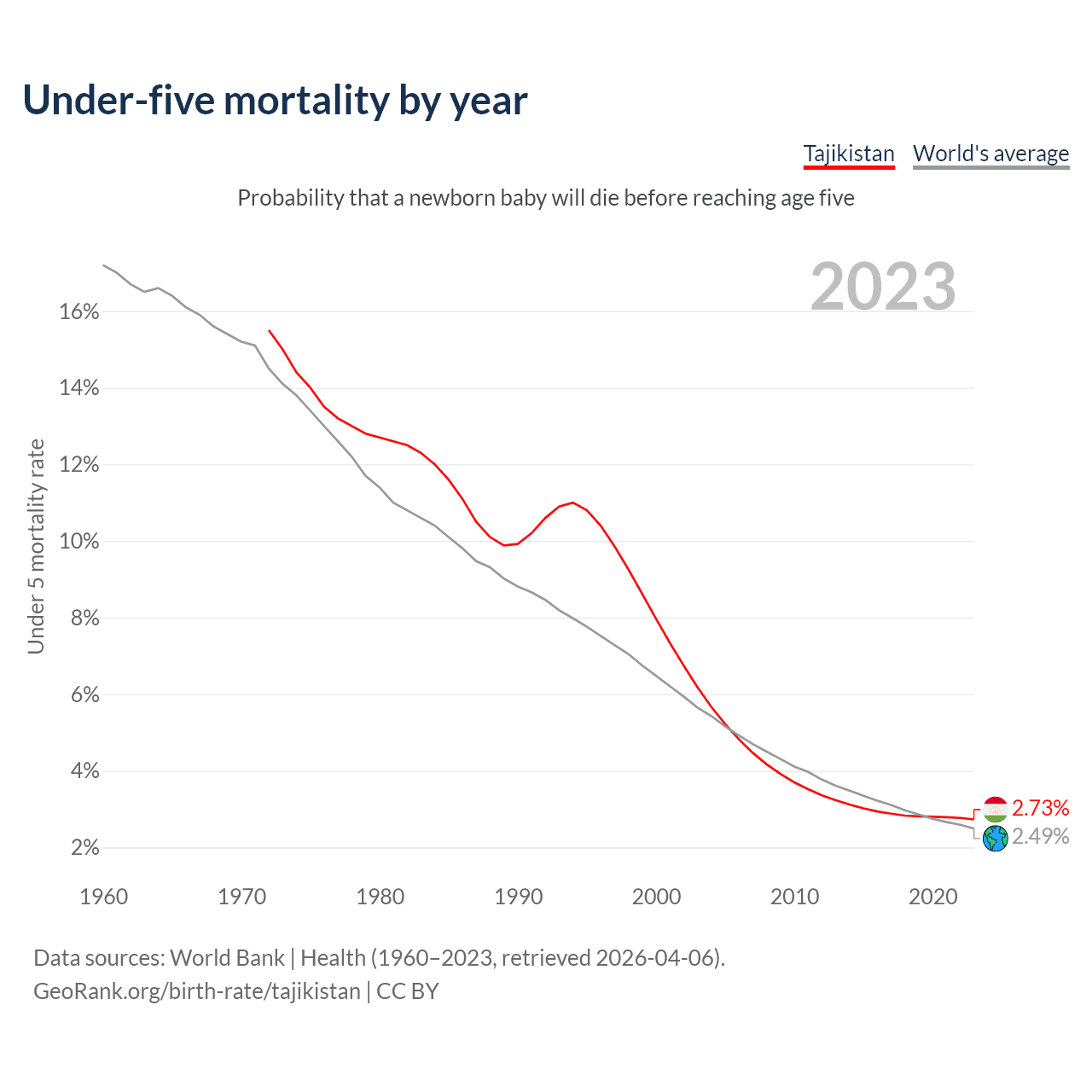 The under-5 mortality rate in Tajikistan was 27.3 deaths per 1,000 live births in 2023 — a 2.73% chance that a newborn baby will die before reaching age five. This is down from 79.7 deaths per 1,000 live births in 2000.