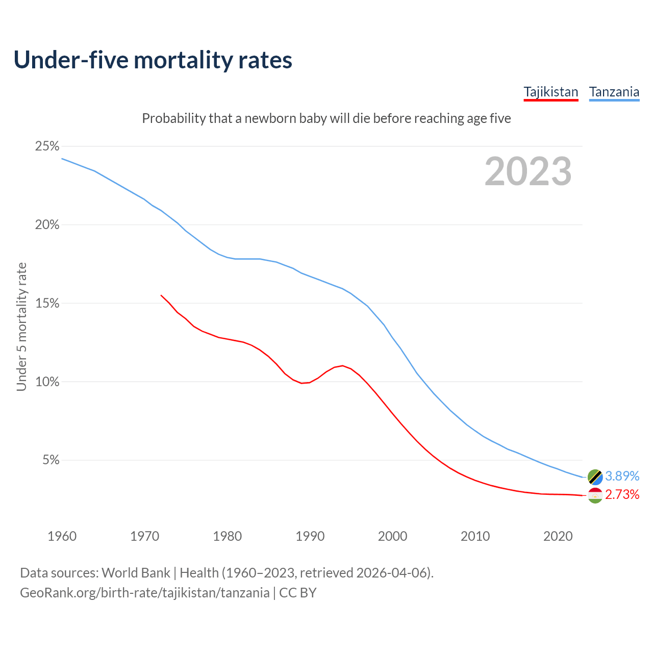 The chance that a newborn baby will die before reaching age five is 2.73% in Tajikistan and 3.89% in Tanzania. Above is a chart with historical data on under-five mortality rates.