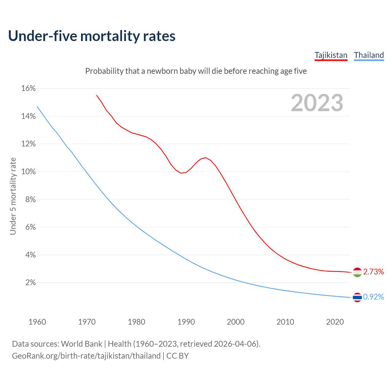 The chance that a newborn baby will die before reaching age five is 2.73% in Tajikistan and 0.92% in Thailand. Above is a chart with historical data on under-five mortality rates.