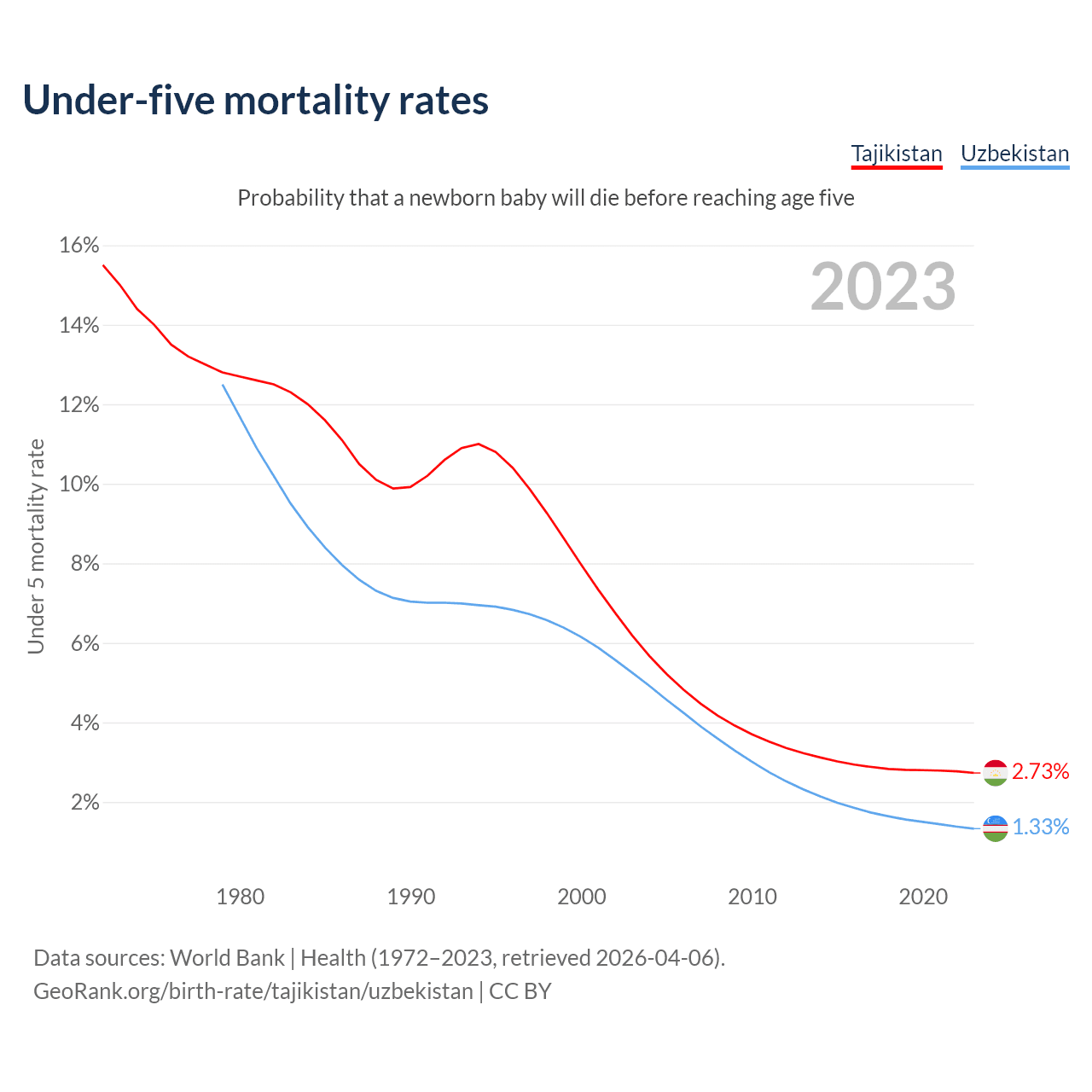 The chance that a newborn baby will die before reaching age five is 2.73% in Tajikistan and 1.33% in Uzbekistan. Above is a chart with historical data on under-five mortality rates.