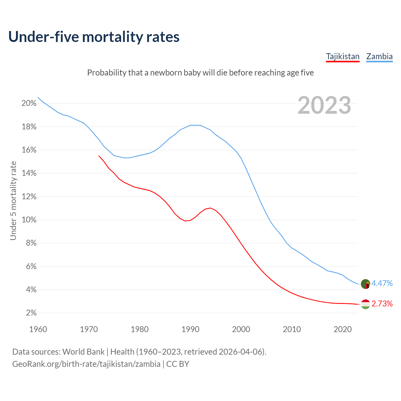 The chance that a newborn baby will die before reaching age five is 2.73% in Tajikistan and 4.47% in Zambia. Above is a chart with historical data on under-five mortality rates.