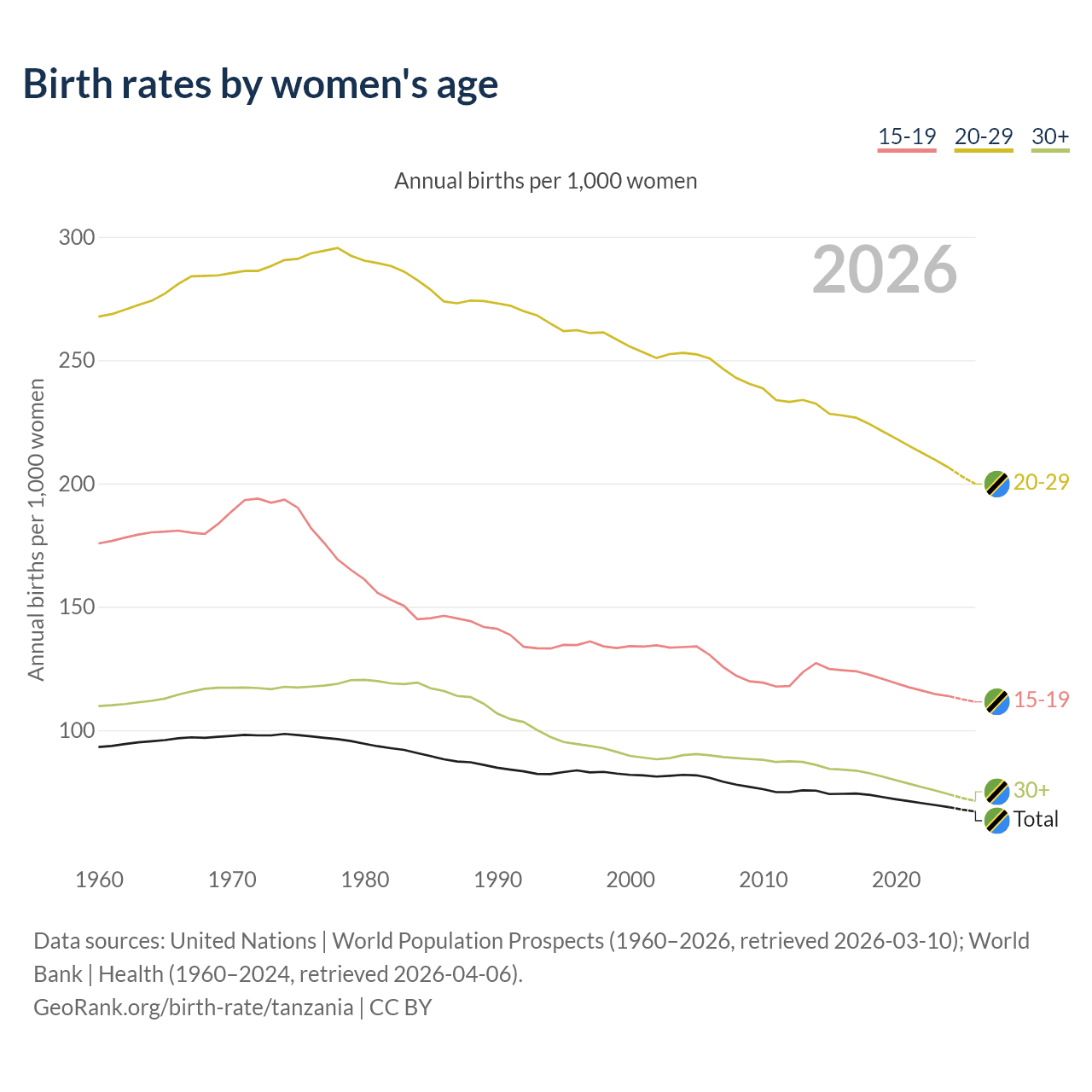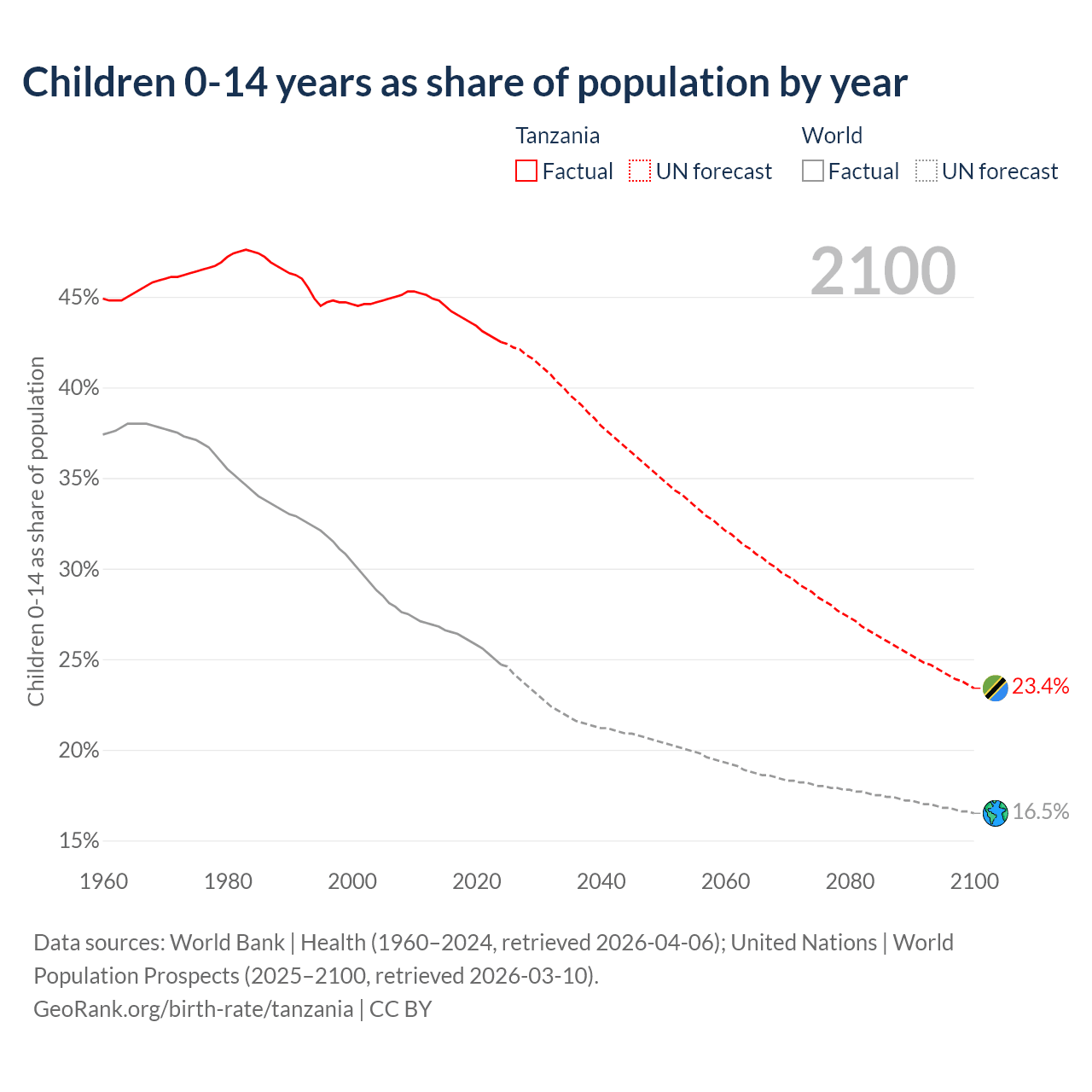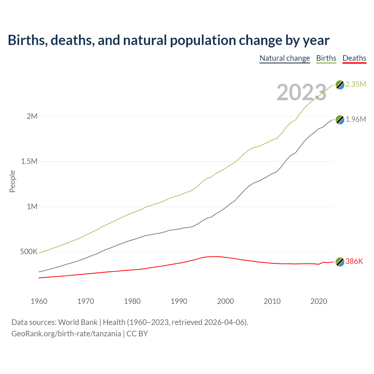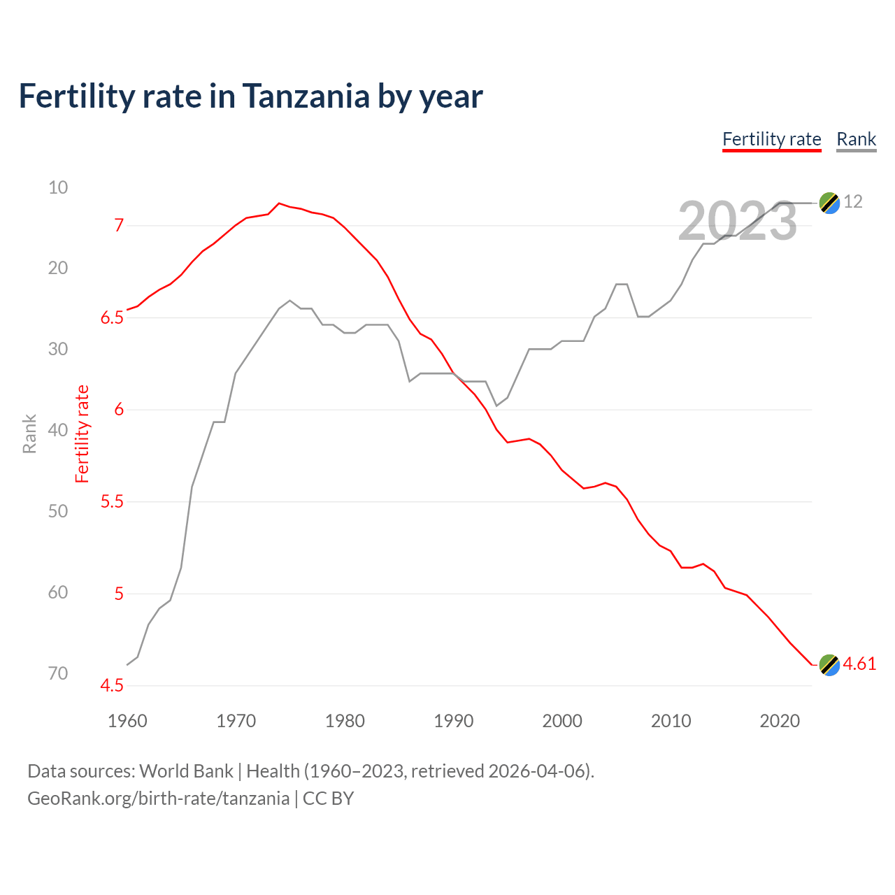 Tanzania has a birth rate of 35.2 (annual births per 1,000 people) and a fertility rate of 4.61 (the average number of children a woman is expected to have over her lifetime based on current age-specific birth rates).