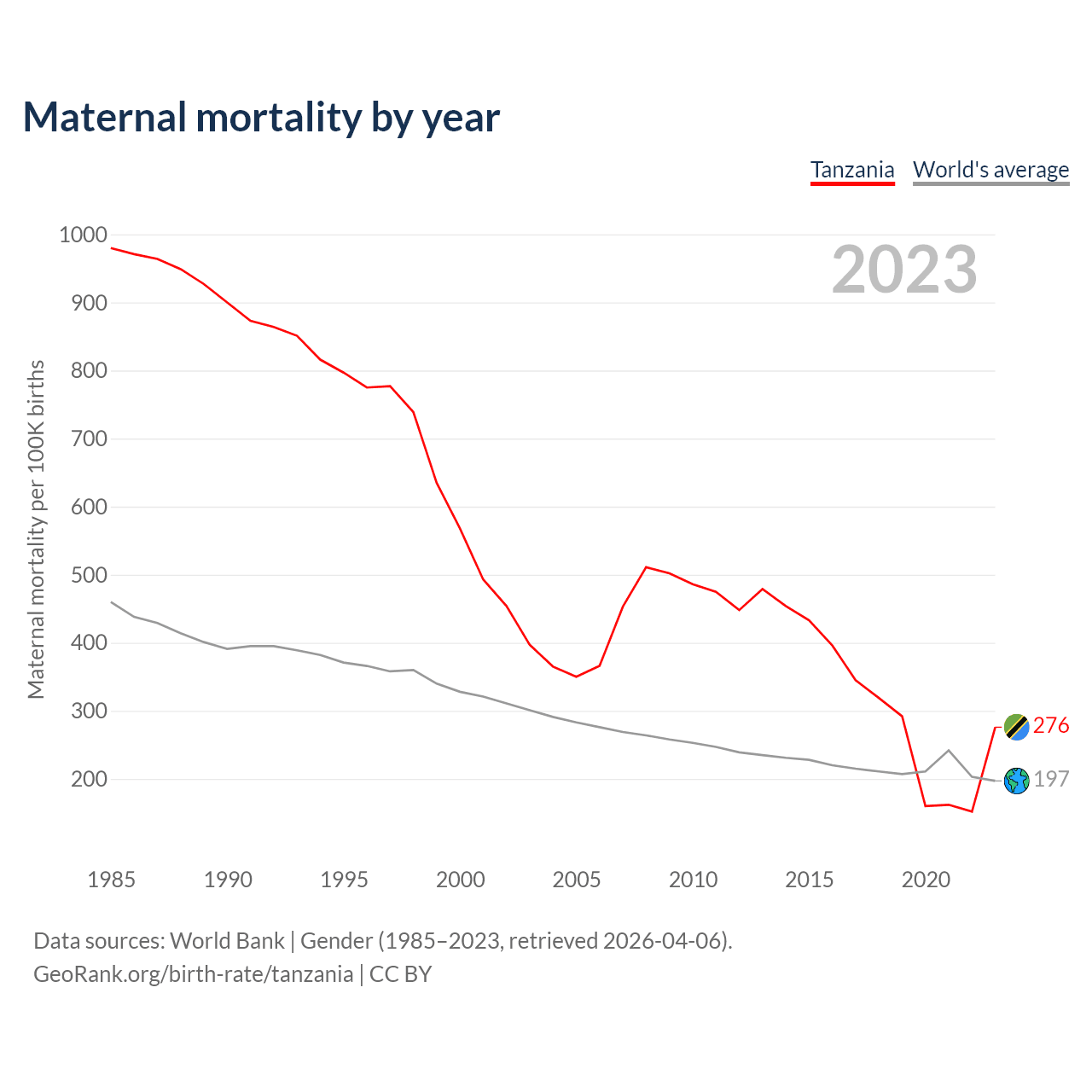 The maternal mortality rate in Tanzania was 276 deaths per 100,000 live births in 2023 — a 0.28% chance of dying during childbirth or within 42 days of pregnancy termination. This is a 51.4% decrease compared to the year 2000.