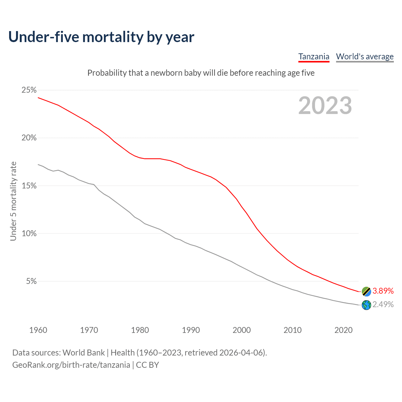 The under-5 mortality rate in Tanzania was 38.9 deaths per 1,000 live births in 2023 — a 3.89% chance that a newborn baby will die before reaching age five. This is down from 128.4 deaths per 1,000 live births in 2000.
