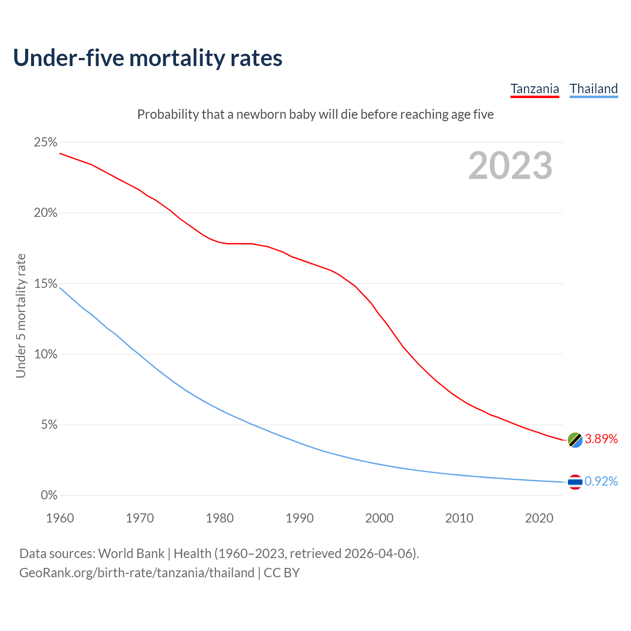 The chance that a newborn baby will die before reaching age five is 3.89% in Tanzania and 0.92% in Thailand. Above is a chart with historical data on under-five mortality rates.