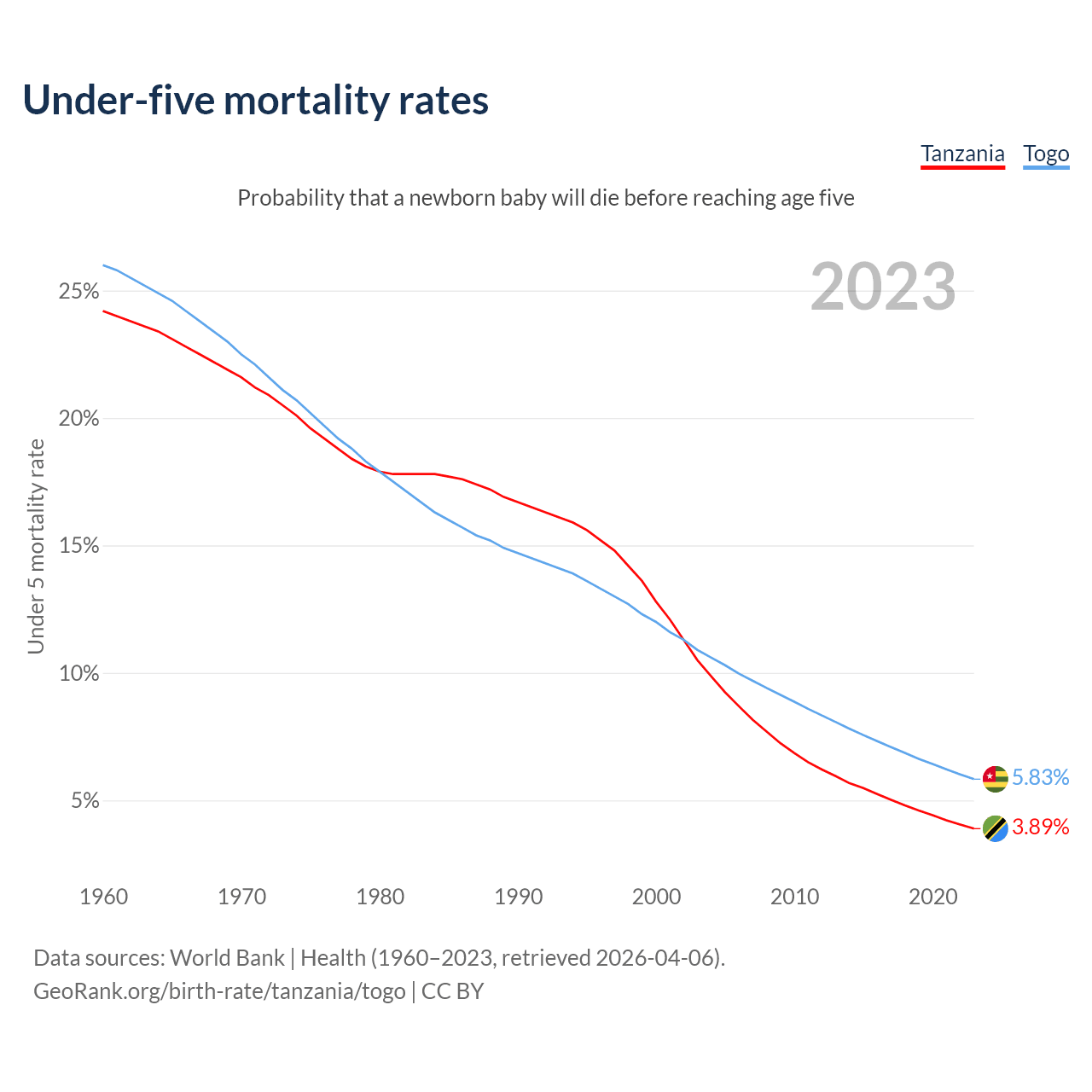 The chance that a newborn baby will die before reaching age five is 3.89% in Tanzania and 5.83% in Togo. Above is a chart with historical data on under-five mortality rates.
