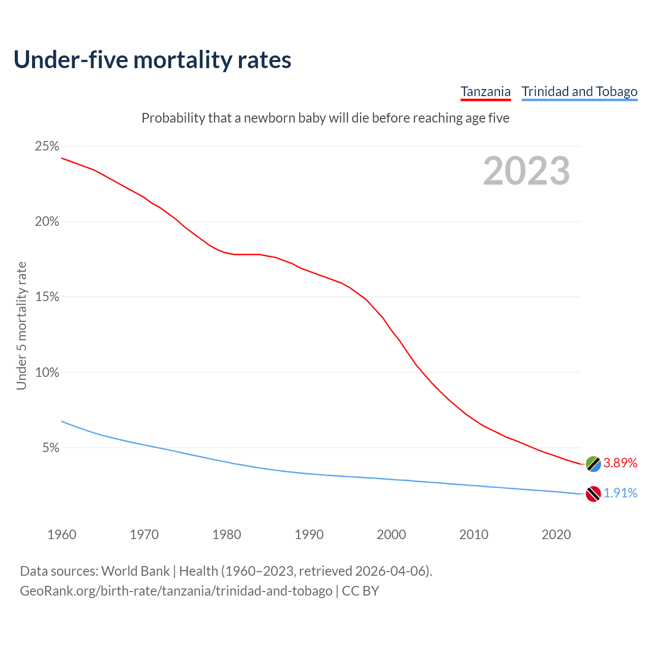 The chance that a newborn baby will die before reaching age five is 3.89% in Tanzania and 1.91% in Trinidad and Tobago. Above is a chart with historical data on under-five mortality rates.
