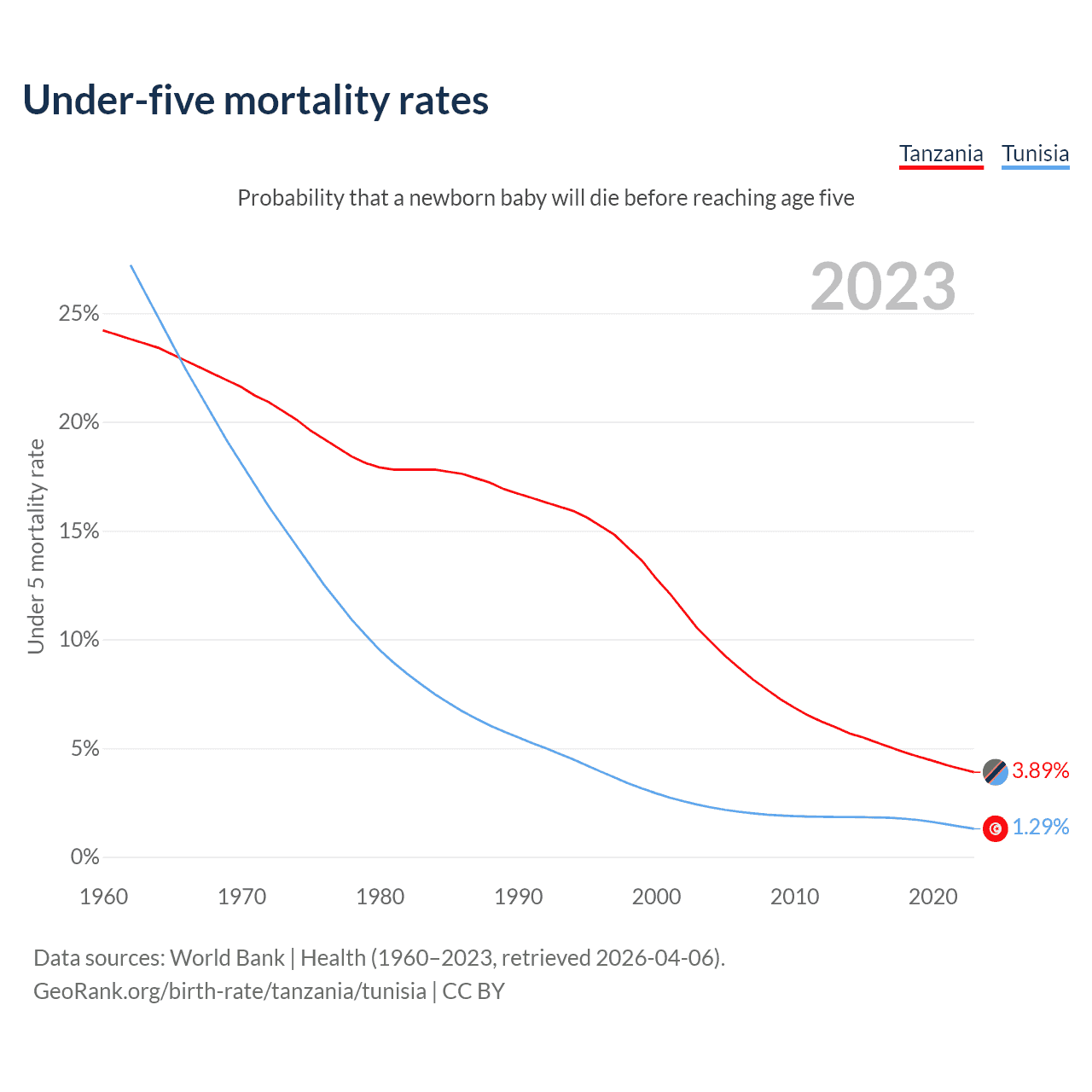 The chance that a newborn baby will die before reaching age five is 3.89% in Tanzania and 1.29% in Tunisia. Above is a chart with historical data on under-five mortality rates.