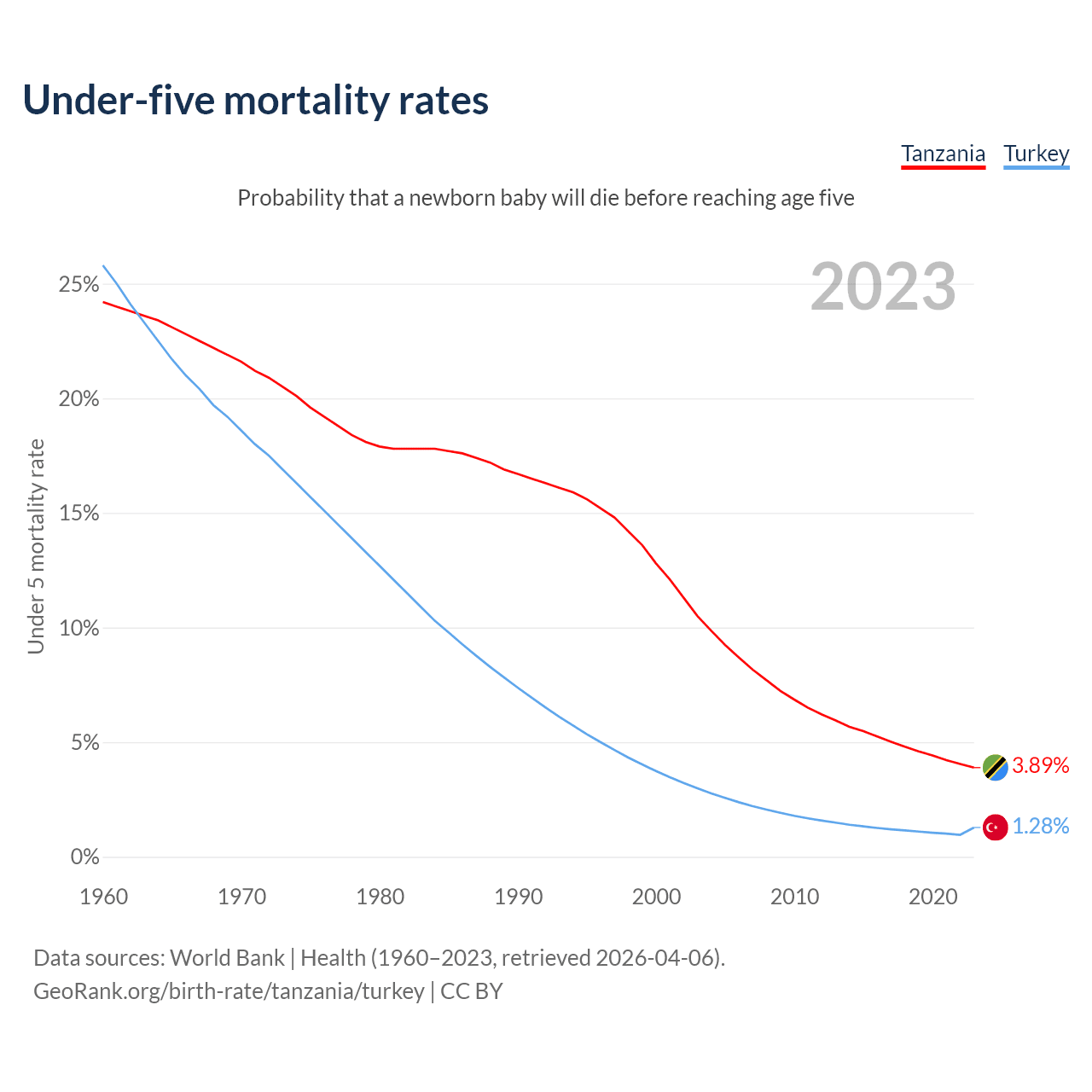 The chance that a newborn baby will die before reaching age five is 3.89% in Tanzania and 1.28% in Turkey. Above is a chart with historical data on under-five mortality rates.