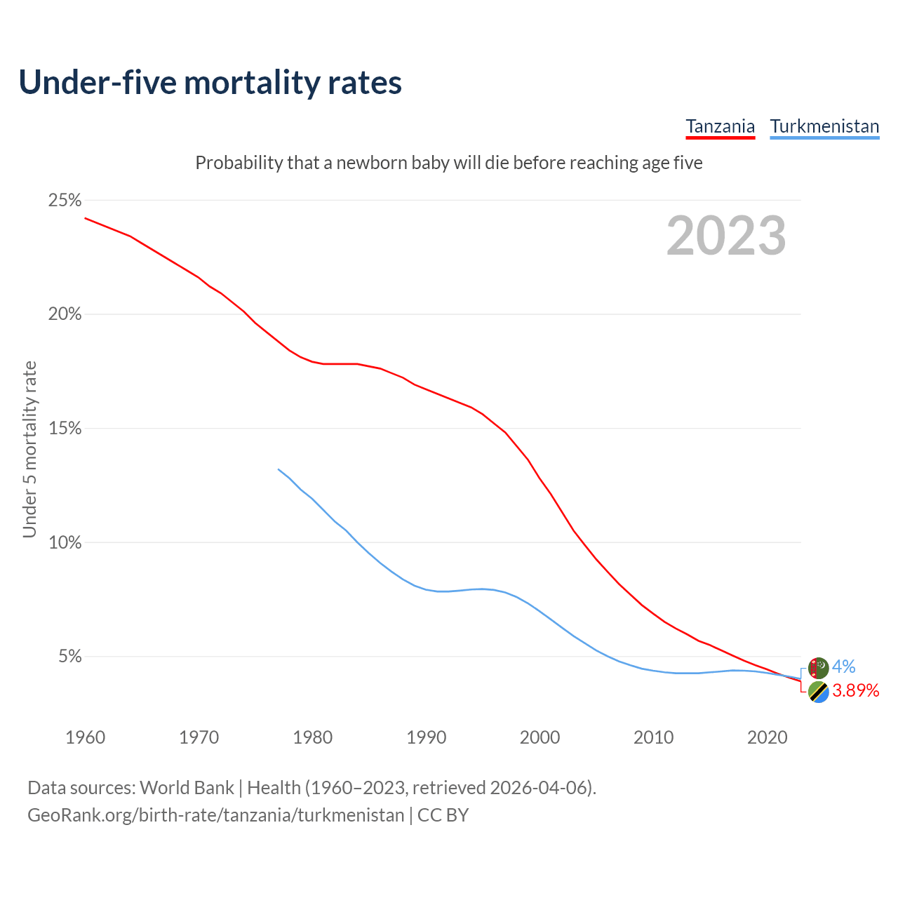 The chance that a newborn baby will die before reaching age five is 3.89% in Tanzania and 4% in Turkmenistan. Above is a chart with historical data on under-five mortality rates.