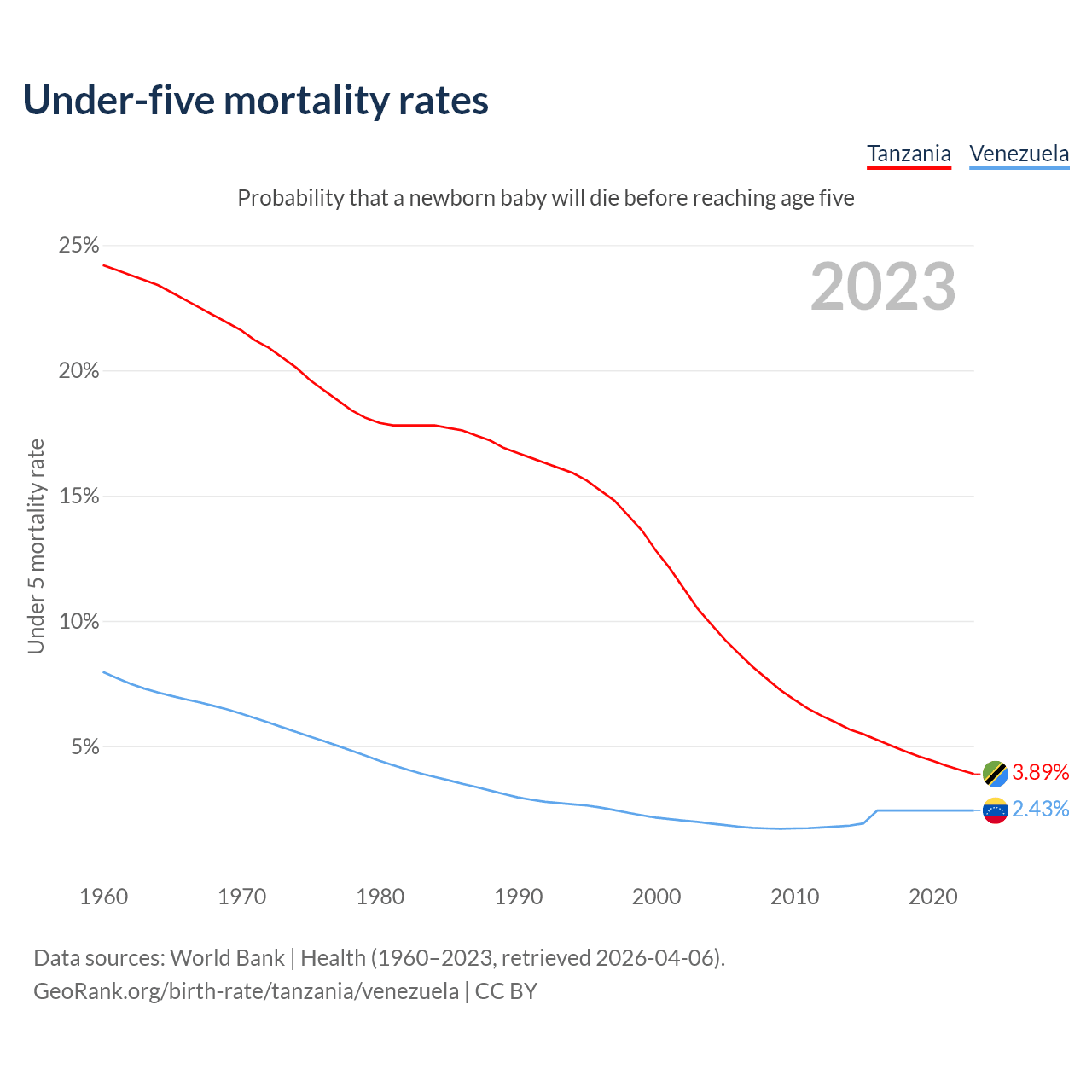 The chance that a newborn baby will die before reaching age five is 3.89% in Tanzania and 2.43% in Venezuela. Above is a chart with historical data on under-five mortality rates.