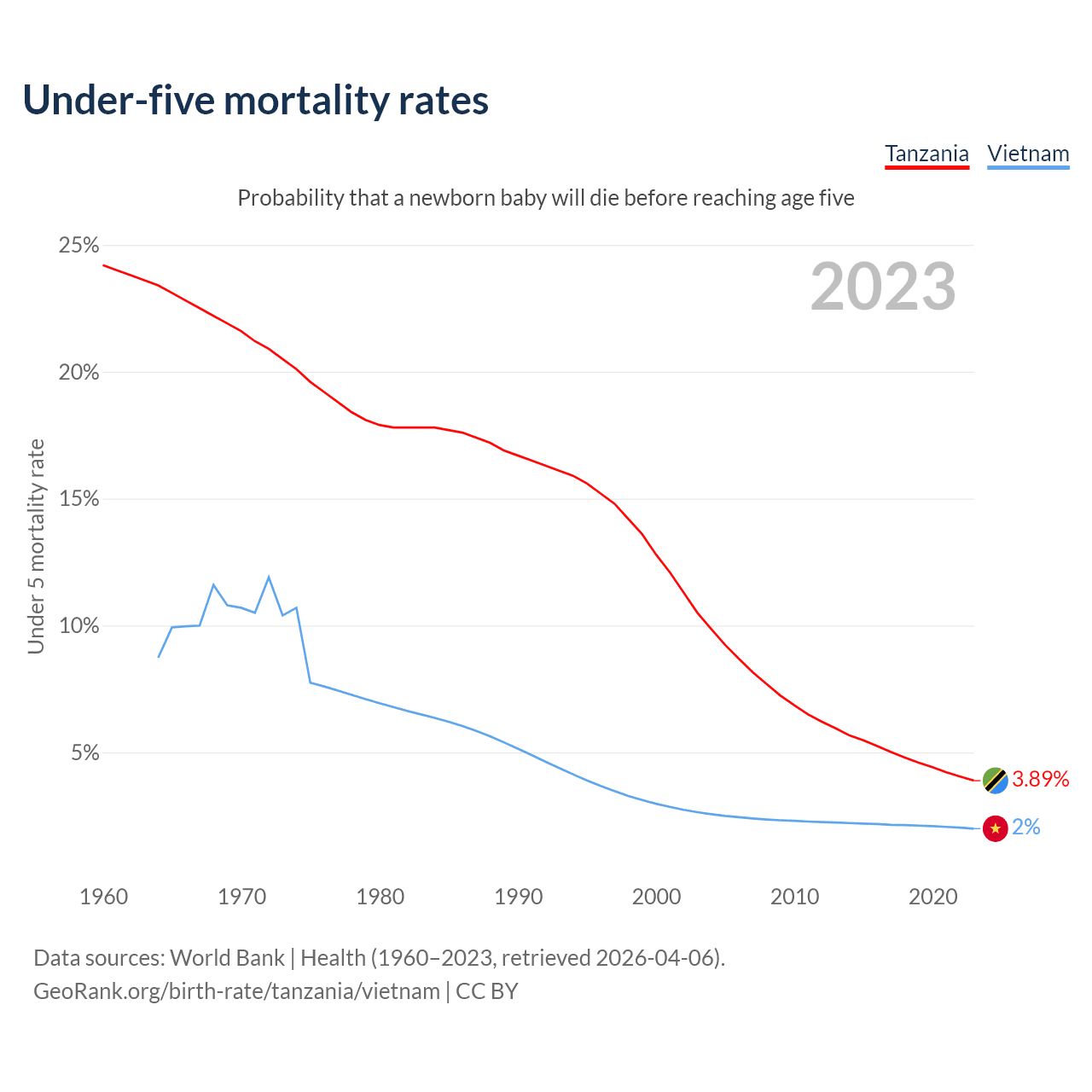 The chance that a newborn baby will die before reaching age five is 3.89% in Tanzania and 2% in Vietnam. Above is a chart with historical data on under-five mortality rates.