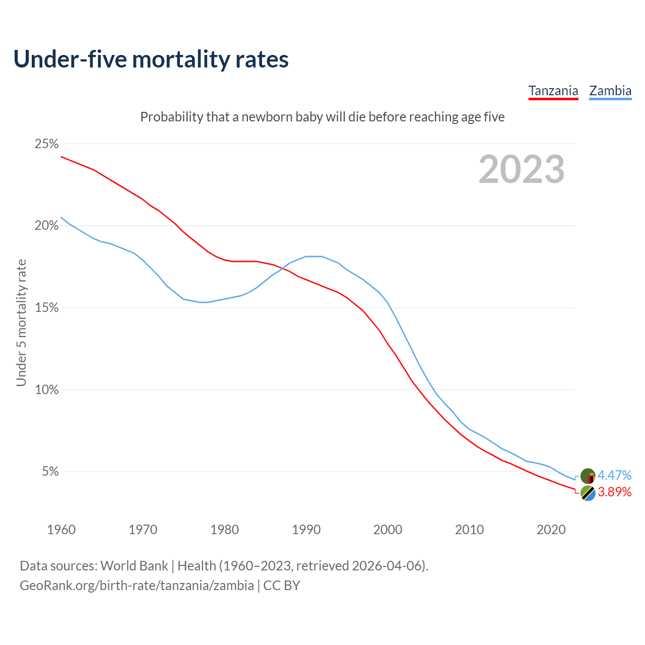 The chance that a newborn baby will die before reaching age five is 3.89% in Tanzania and 4.47% in Zambia. Above is a chart with historical data on under-five mortality rates.