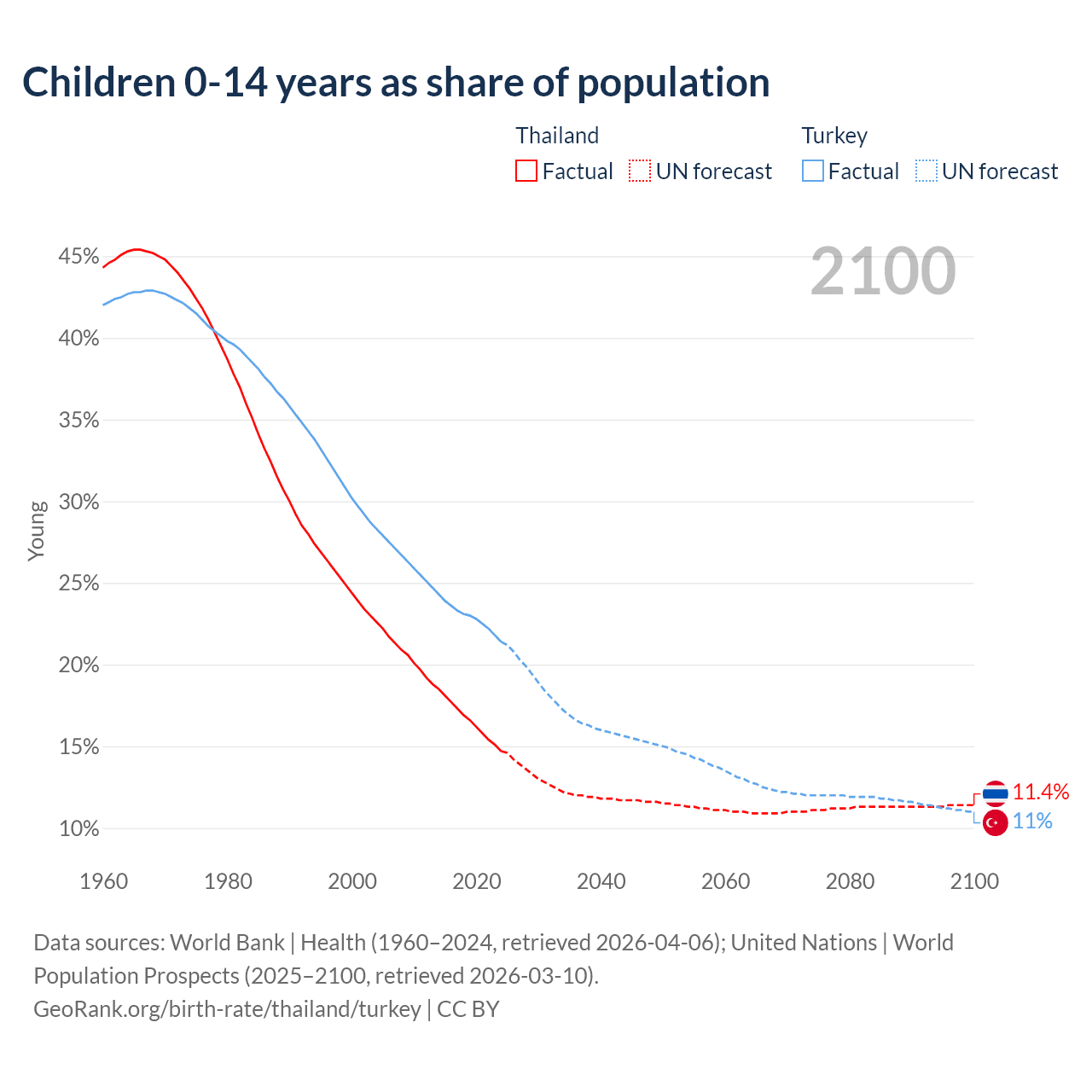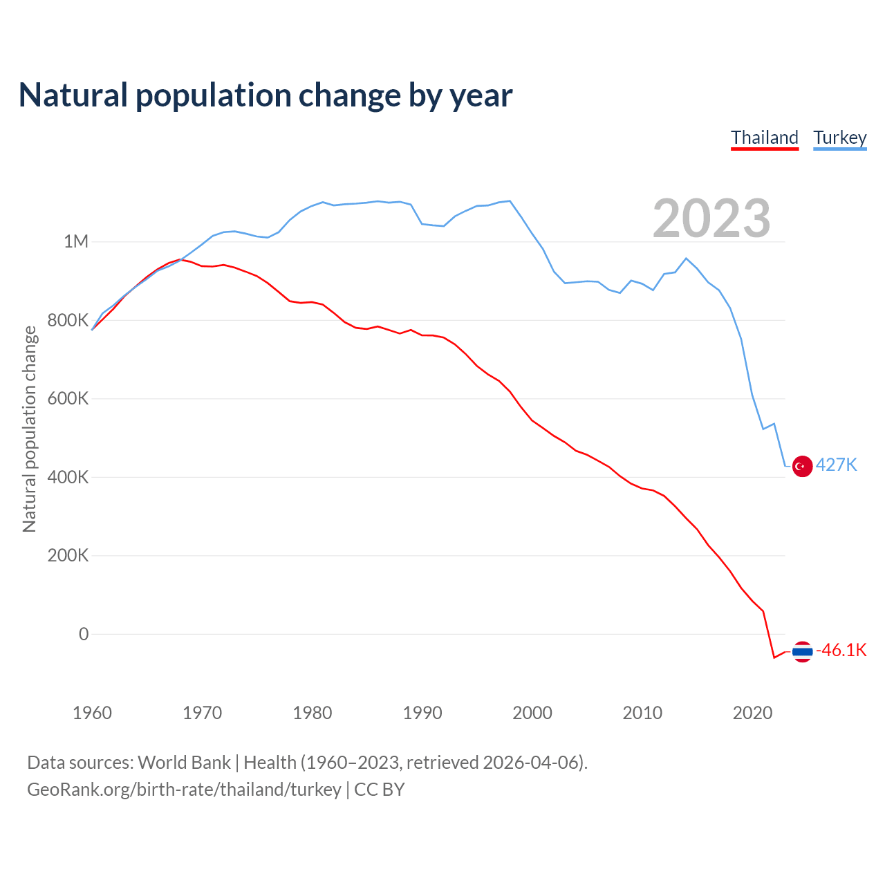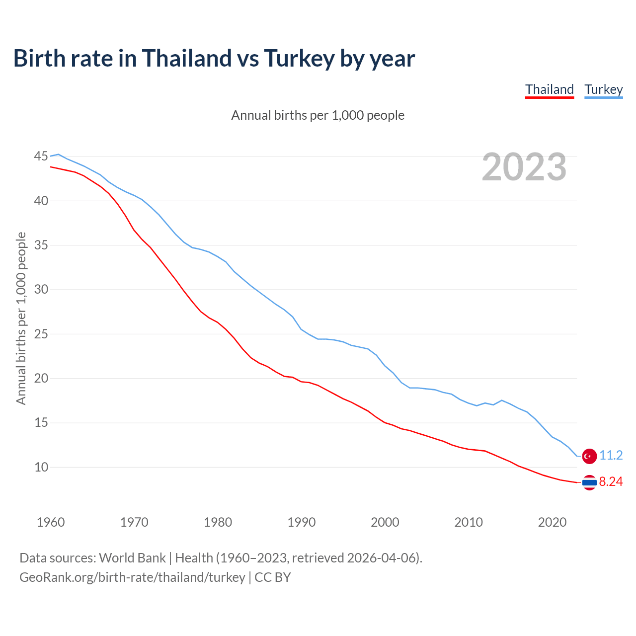 According to the latest available data on birth rates, the fertility rate in Thailand was 1.21 children per woman in 2023, compared to 1.51 in Turkey in 2023. The replacement level is considered to be 2.1 children per woman.