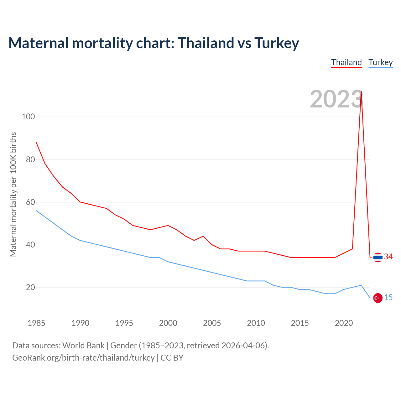 The maternal mortality rate, which is the probability of dying during childbirth or within 42 days of pregnancy termination, is 34 deaths per 100,000 live births in Thailand, compared to 15 deaths in Turkey.