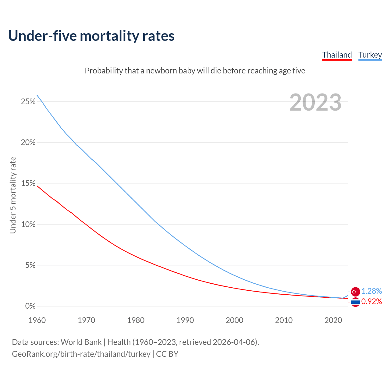 The chance that a newborn baby will die before reaching age five is 0.92% in Thailand and 1.28% in Turkey. Above is a chart with historical data on under-five mortality rates.