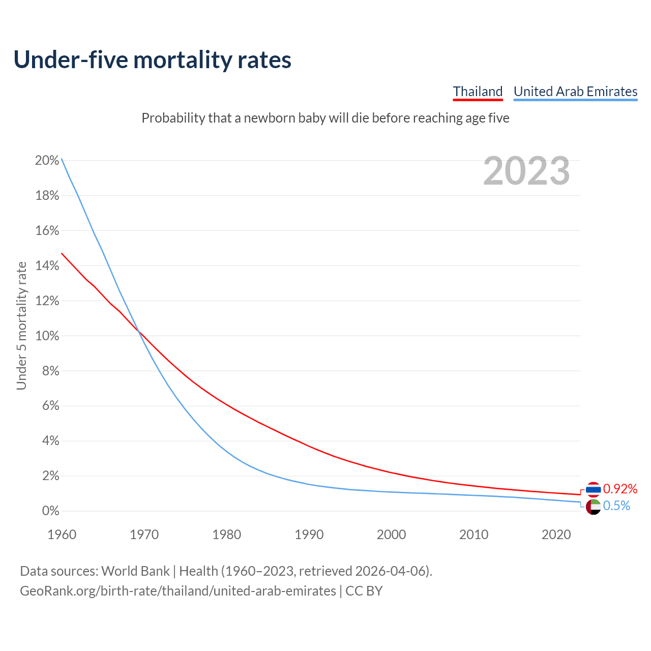 The chance that a newborn baby will die before reaching age five is 0.92% in Thailand and 0.5% in the United Arab Emirates. Above is a chart with historical data on under-five mortality rates.