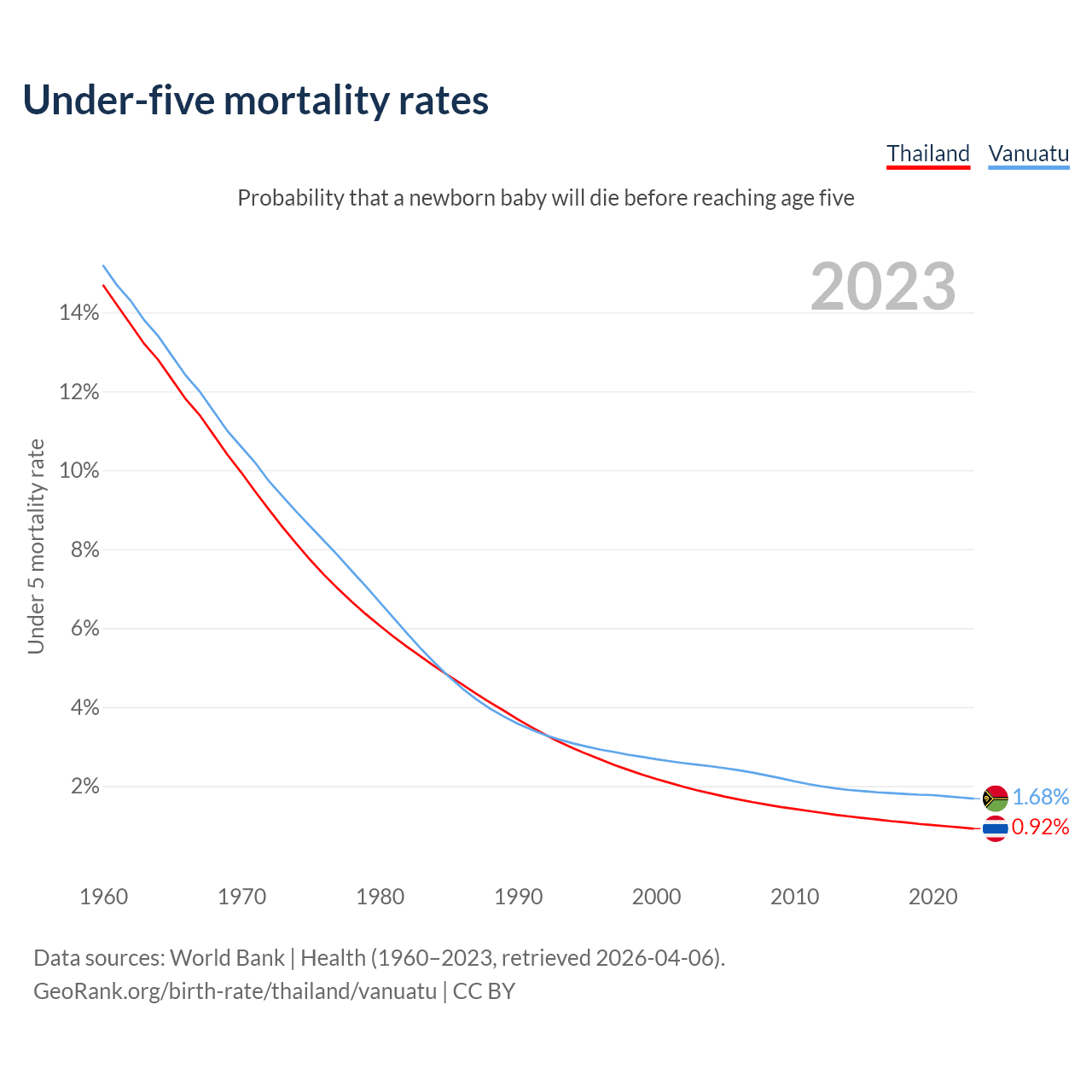 The chance that a newborn baby will die before reaching age five is 0.92% in Thailand and 1.68% in Vanuatu. Above is a chart with historical data on under-five mortality rates.