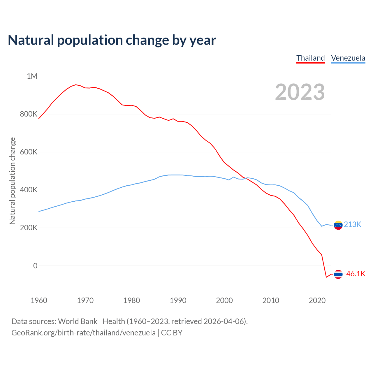 According to the latest available data on birth rates, the fertility rate in Thailand was 1.21 children per woman in 2023, compared to 2.08 in Venezuela in 2023. The replacement level is considered to be 2.1 children per woman.