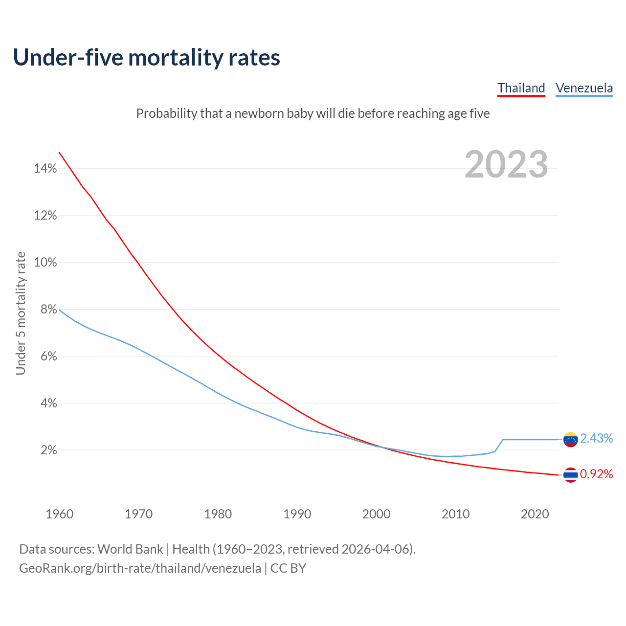The chance that a newborn baby will die before reaching age five is 0.92% in Thailand and 2.43% in Venezuela. Above is a chart with historical data on under-five mortality rates.