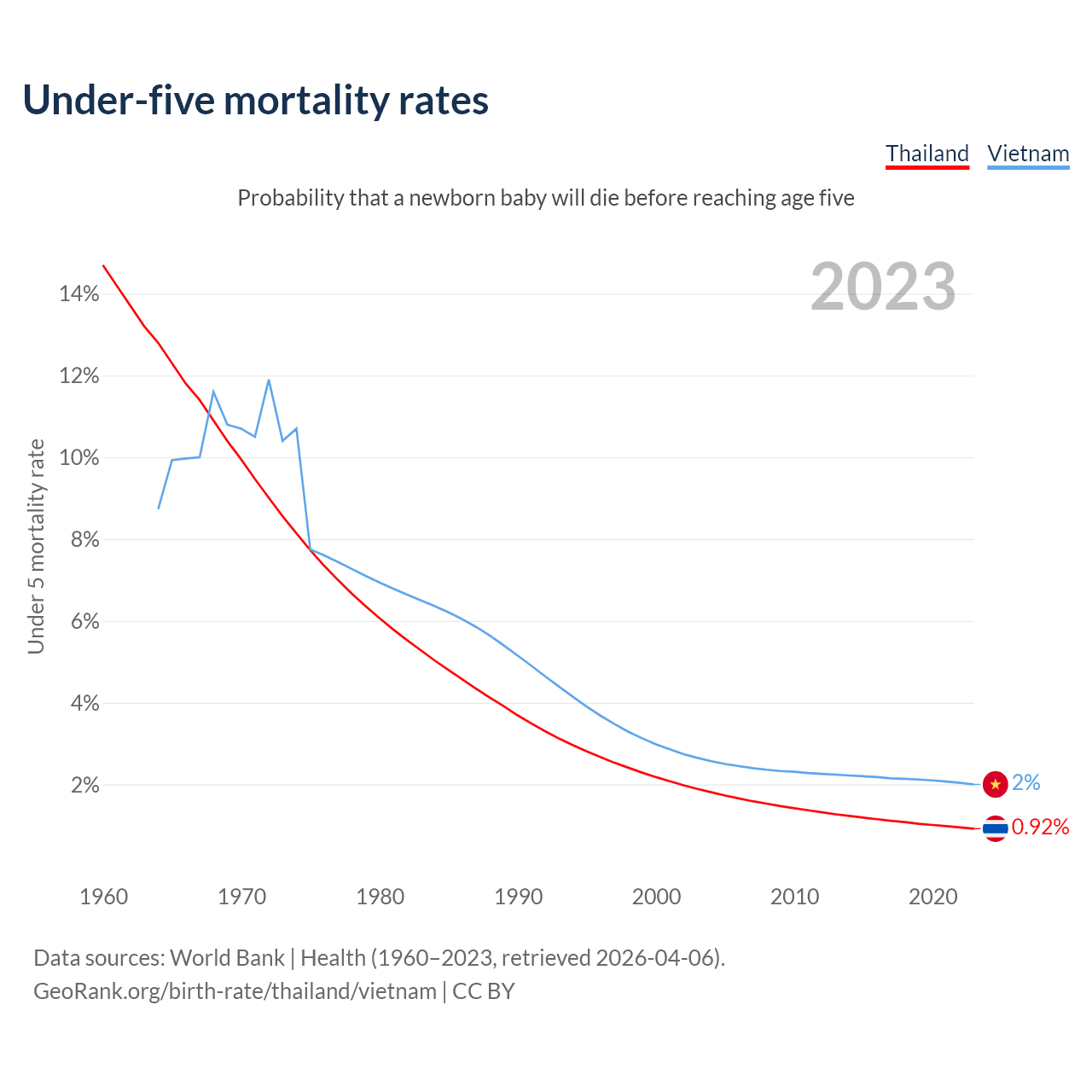 The chance that a newborn baby will die before reaching age five is 0.92% in Thailand and 2% in Vietnam. Above is a chart with historical data on under-five mortality rates.