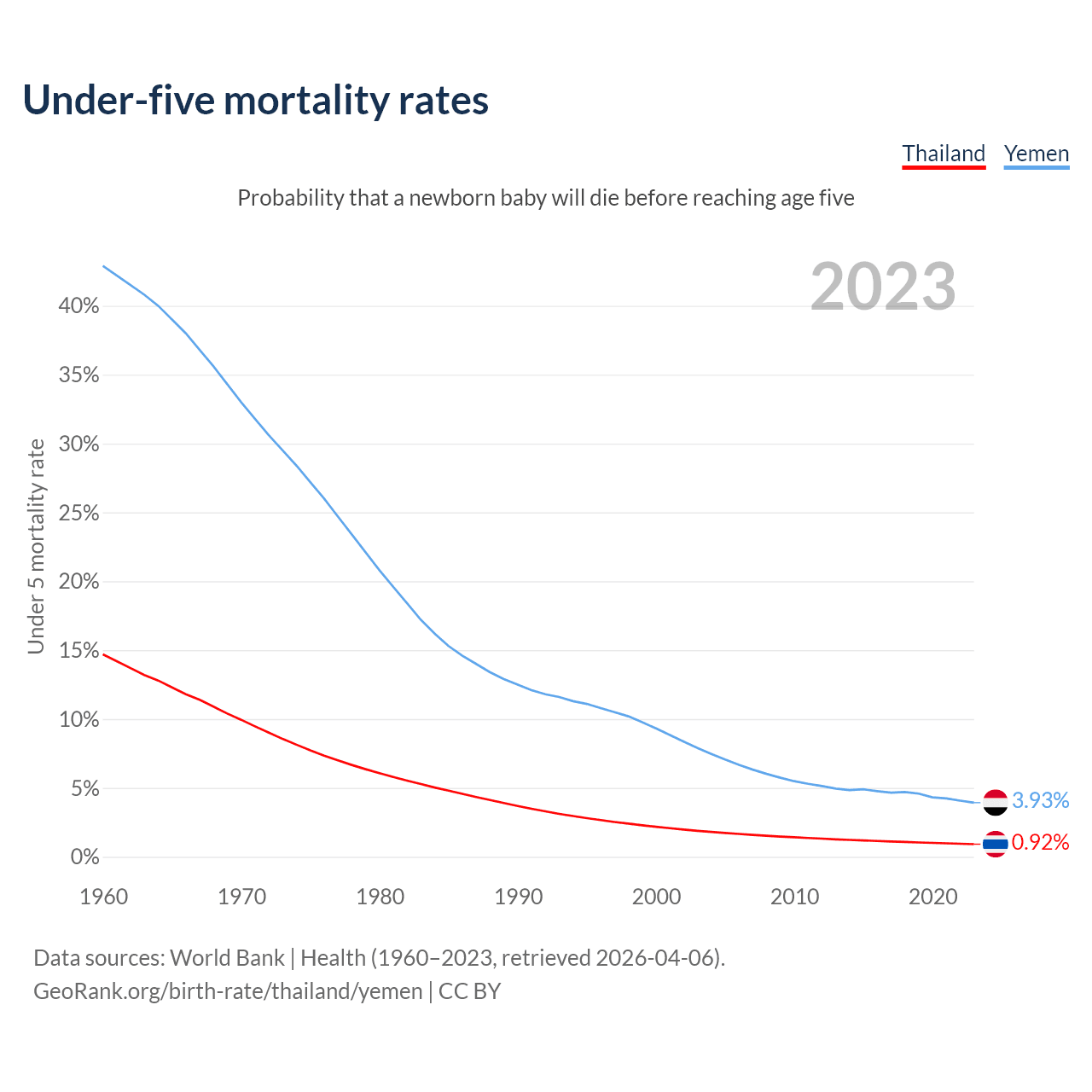 The chance that a newborn baby will die before reaching age five is 0.92% in Thailand and 3.93% in Yemen. Above is a chart with historical data on under-five mortality rates.