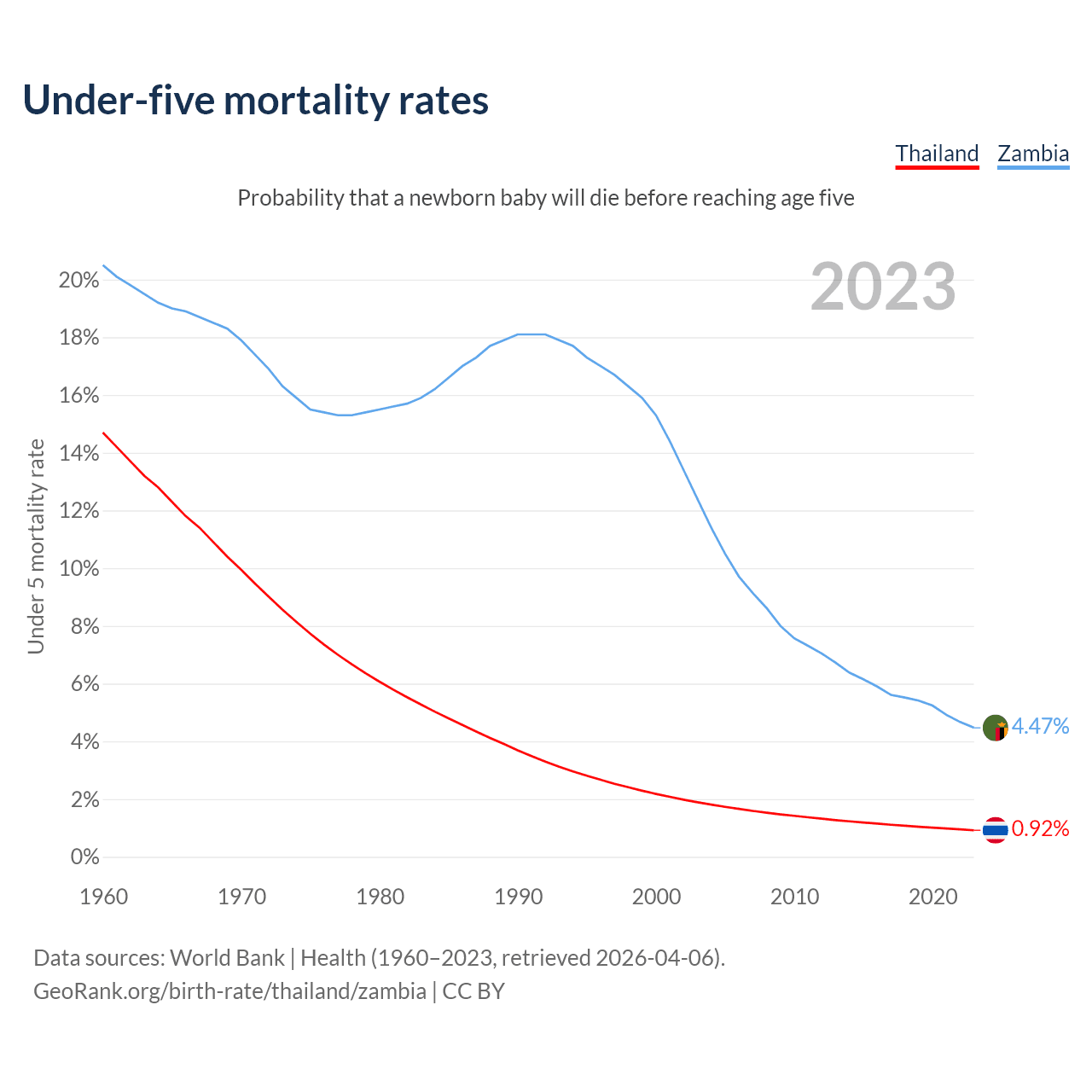The chance that a newborn baby will die before reaching age five is 0.92% in Thailand and 4.47% in Zambia. Above is a chart with historical data on under-five mortality rates.