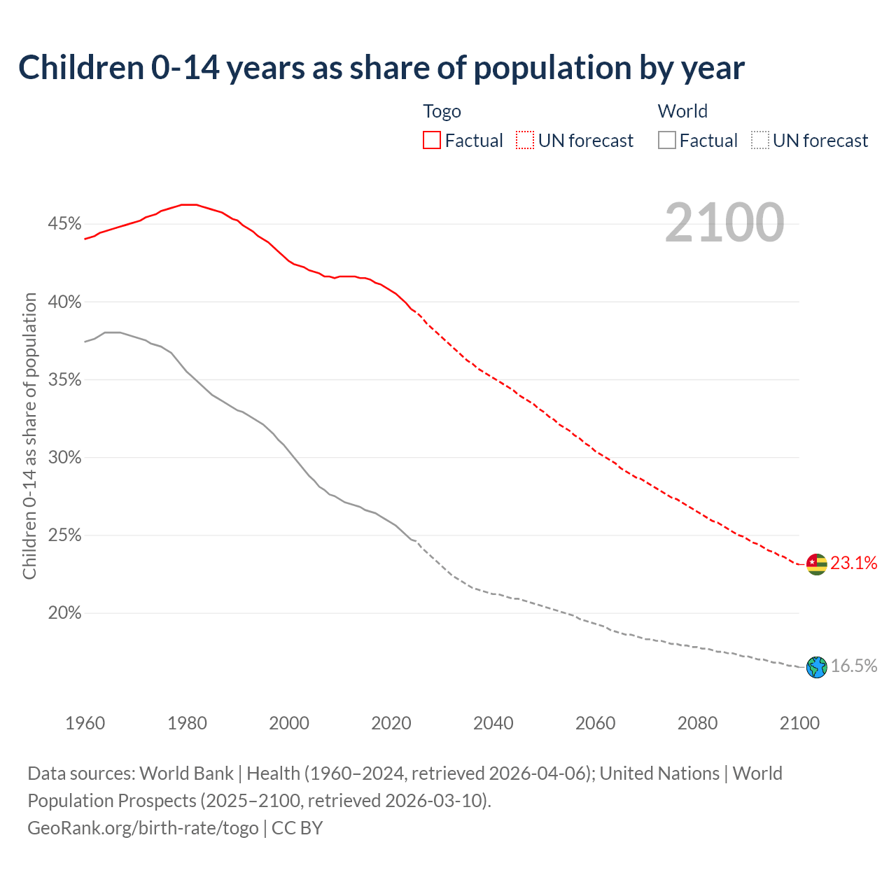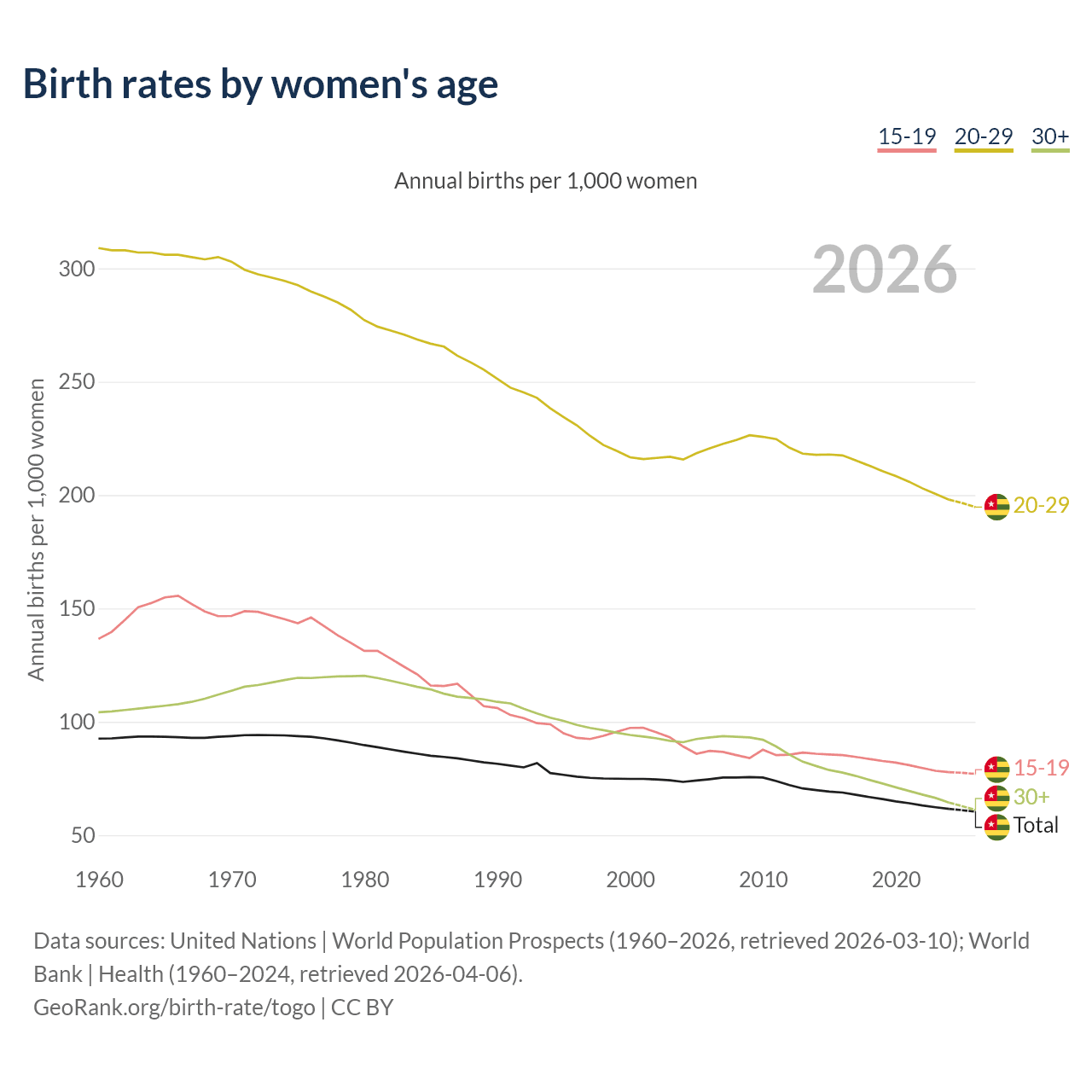 Togo has a birth rate of 31.1 (annual births per 1,000 people) and a fertility rate of 4.19 (the average number of children a woman is expected to have over her lifetime based on current age-specific birth rates).