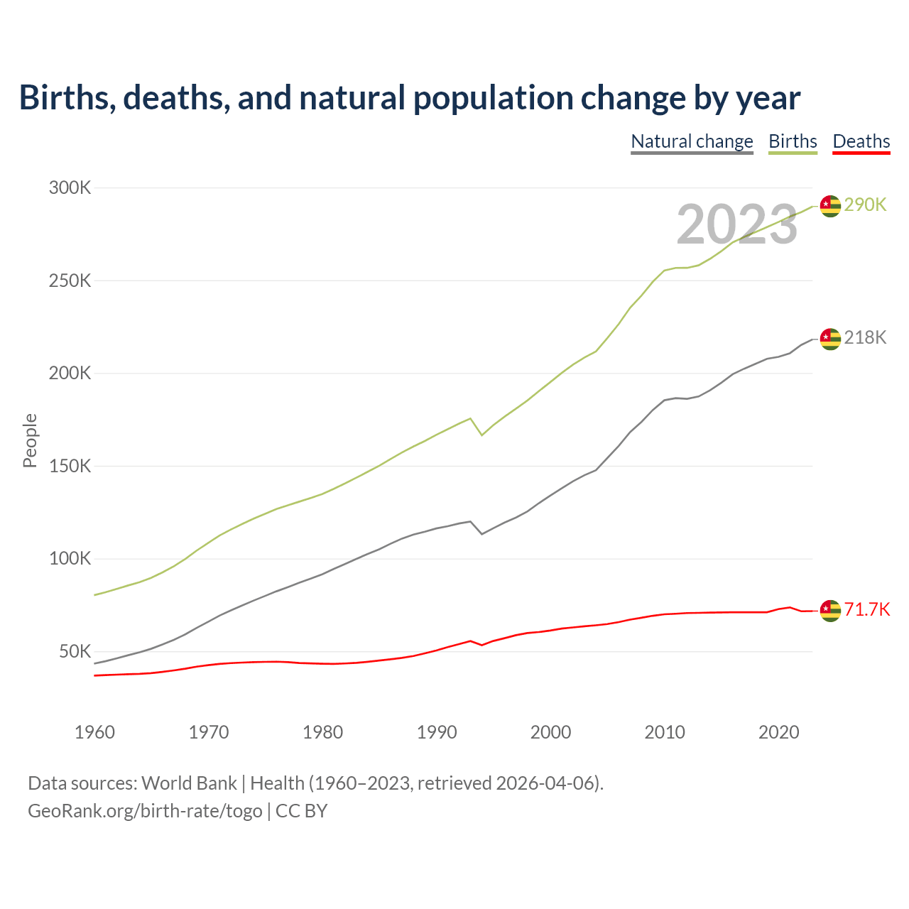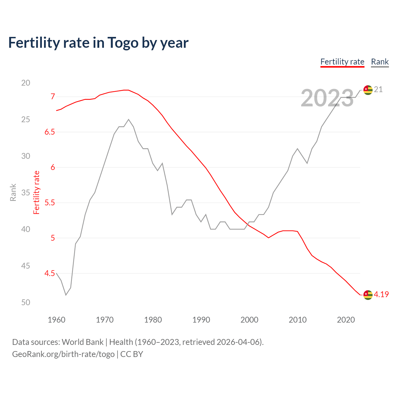 According to the latest birth rate data available, the fertility rate in Togo is 4.19, which is above the replacement level of 2.1 children per woman. In 1993, the fertility rate was 5.78 — a 27.5% decline in 30 years.