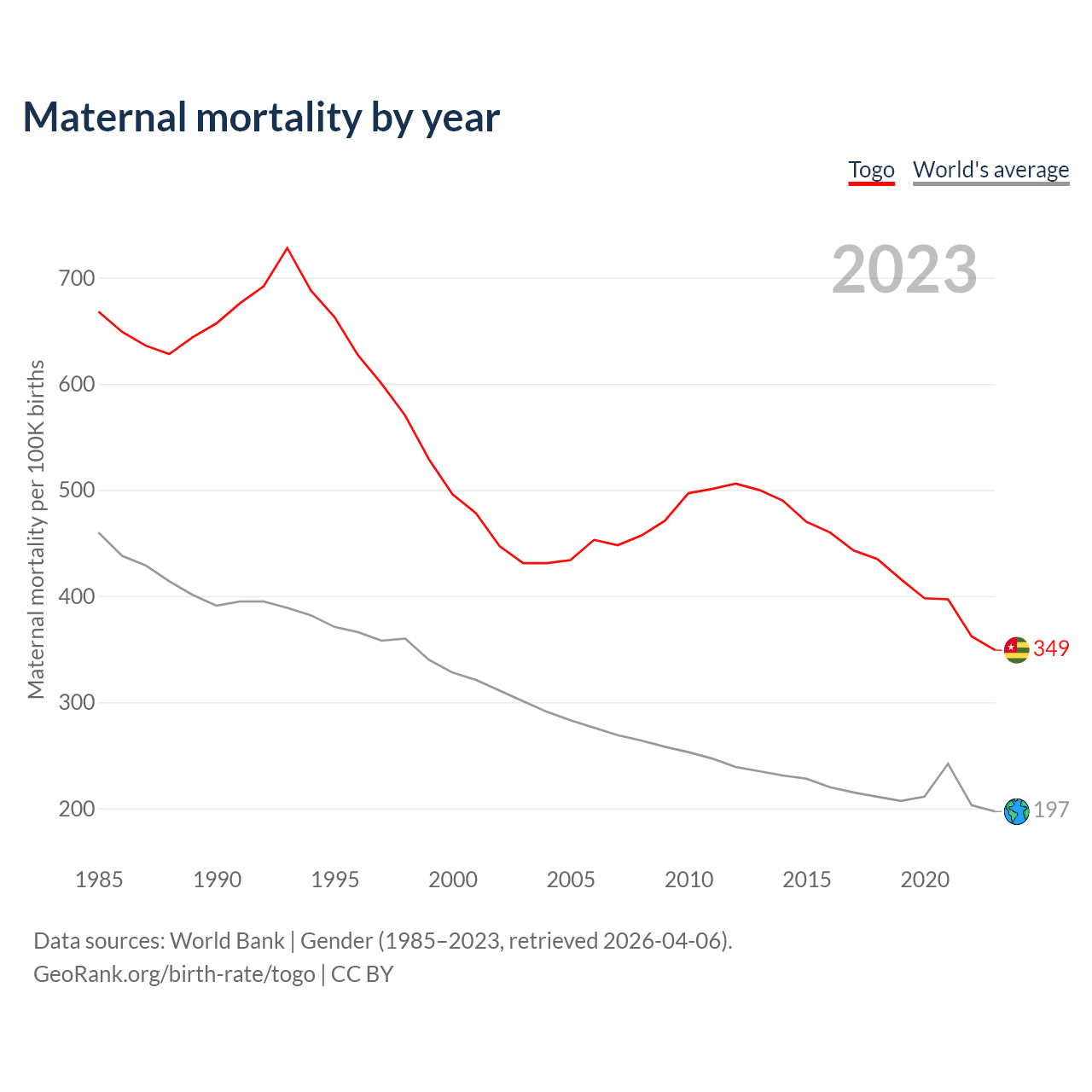 The maternal mortality rate in Togo was 349 deaths per 100,000 live births in 2023 — a 0.35% chance of dying during childbirth or within 42 days of pregnancy termination. This is a 29.6% decrease compared to the year 2000.