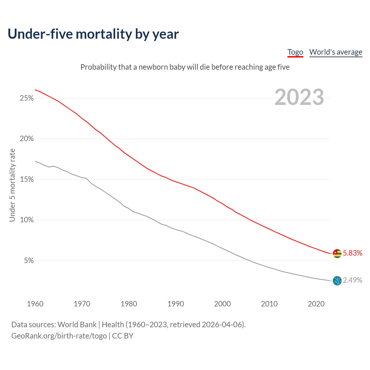 The under-5 mortality rate in Togo was 58.3 deaths per 1,000 live births in 2023 — a 5.83% chance that a newborn baby will die before reaching age five. This is down from 119.6 deaths per 1,000 live births in 2000.