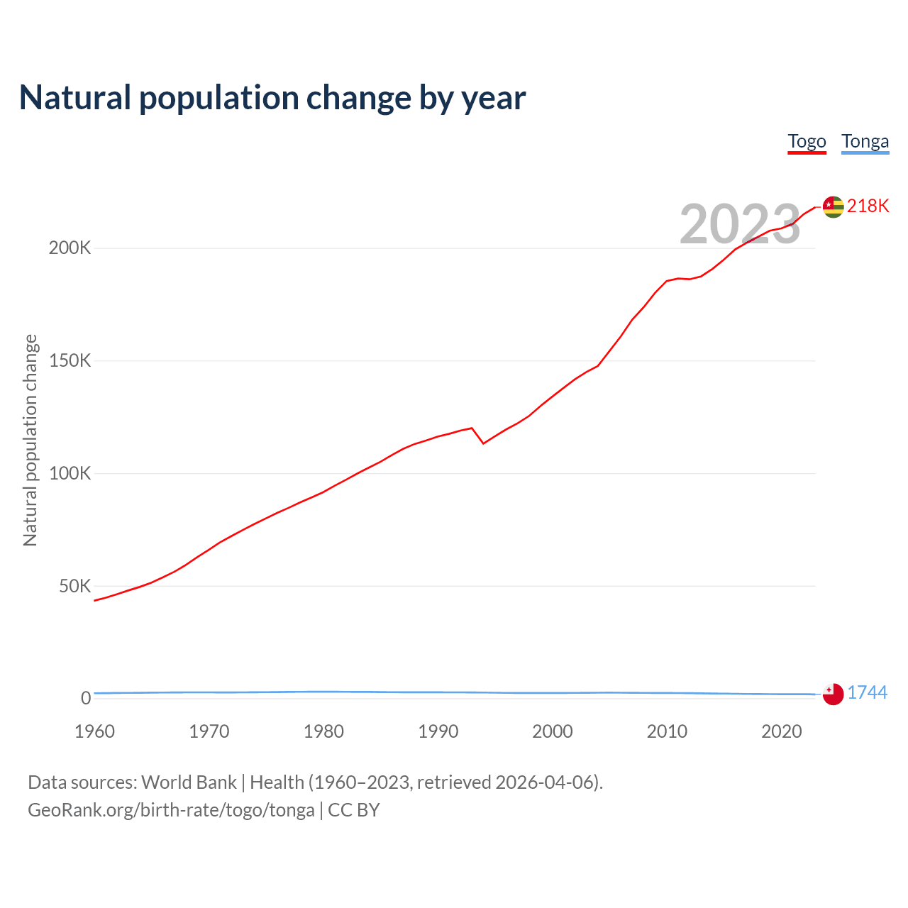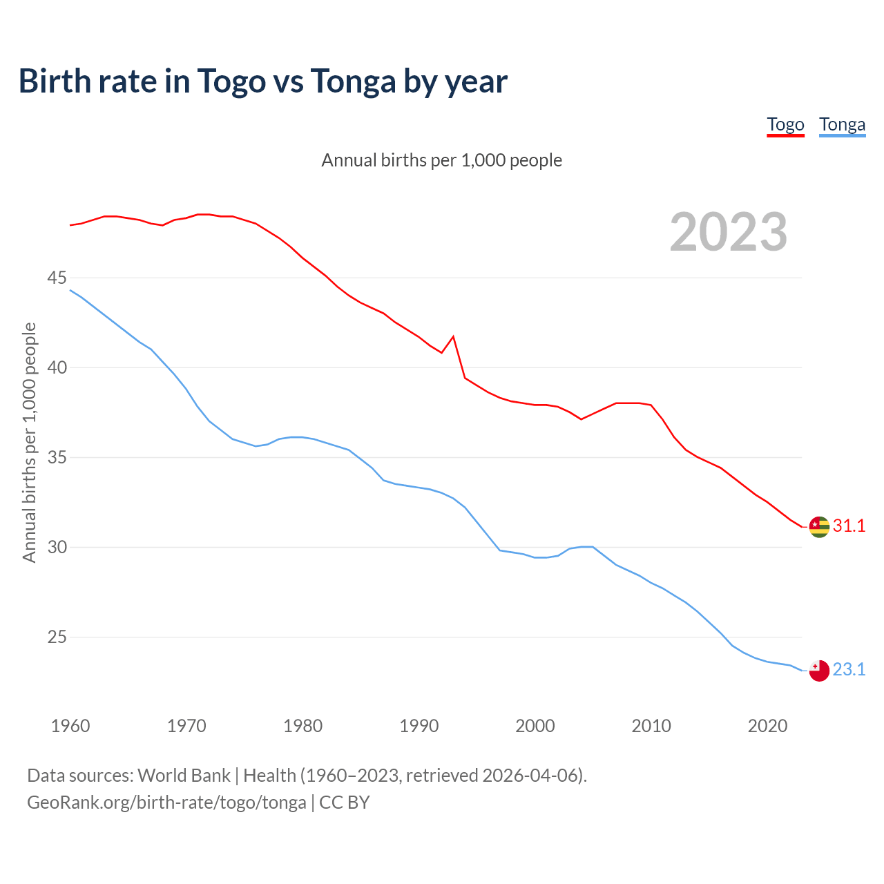 Togo has an annual birth rate of 31.1 births per 1,000 people, compared to 23.1 for Tonga. The average number of children a woman is expected to have during her lifetime — the fertility rate, is 4.19 in Togo and 3.13 in Tonga — 25.4% difference.
