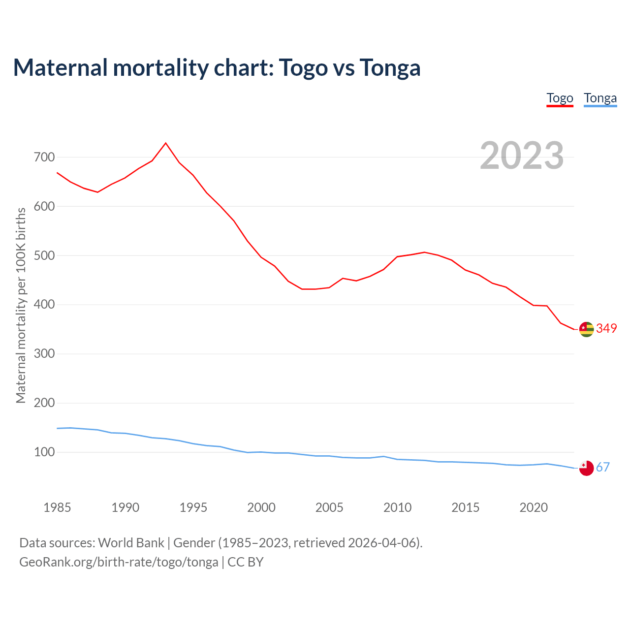 The maternal mortality rate, which is the probability of dying during childbirth or within 42 days of pregnancy termination, is 349 deaths per 100,000 live births in Togo, compared to 67 deaths in Tonga.